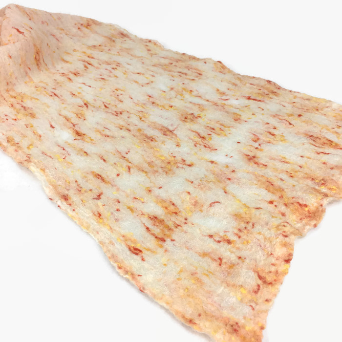 Amazingly lightweight and sheer yet soft and warm, this scarf has been made using a blend of wool and silk fibres, in pretty peachy orange colours, nuno felted in a very fine layer onto a silk chiffon fabric. The scarf is felted on both sides of the silk. Varying dye colour uptake of the wool and silk fibres in the blend creates a speckled/tweed effect. The nuno felting process causes the woollen fibres to migrate through the silk and bind with it to create a sheer but strong material.