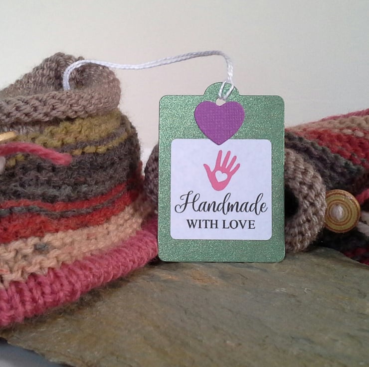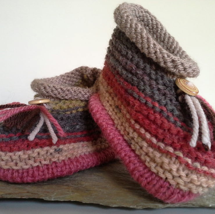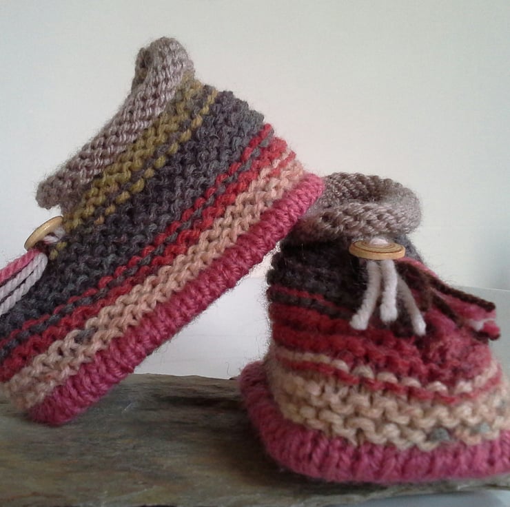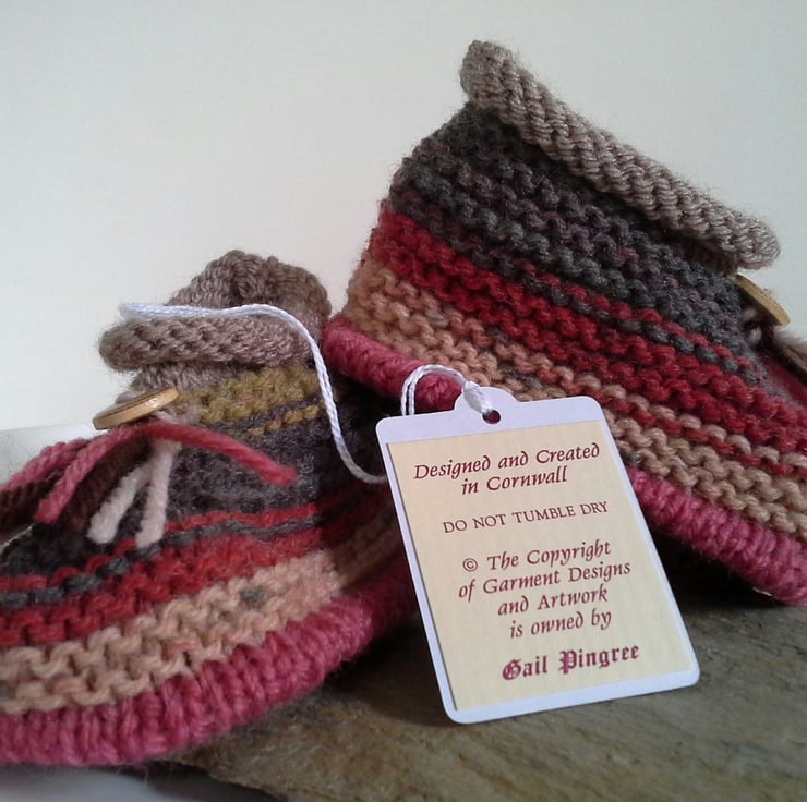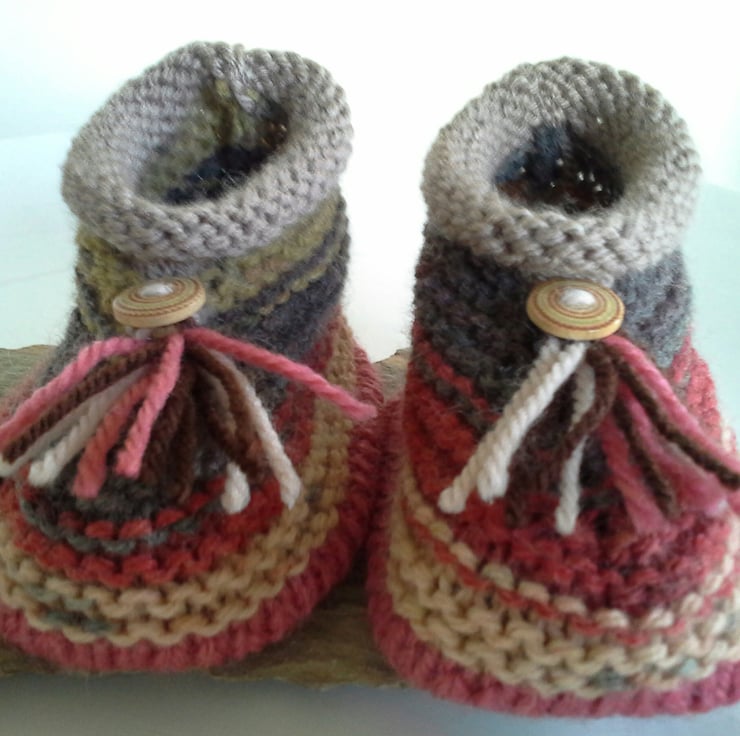 A sweet practical pair of baby boy's booties designed and totally hand crafted using quality branded British machine washable manufactured yarns. The multicoloured yarn contains 25 % pure new wool, making them very warm. I have designed them to have plenty of room for natural movement during wear with or without socks. The genuine wooden buttons and tassels have been very securely attached for total baby's safety.