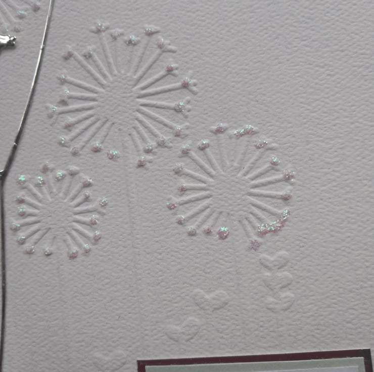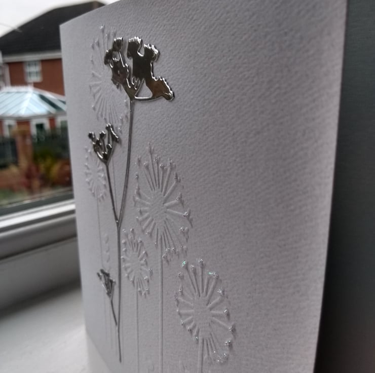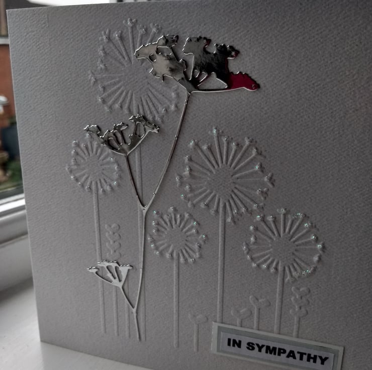 Consisting of quality white card which had been embossed with a dandelion design with silver raised highlights. A beautiful stem die cut from silver mirri card. Finished off with in sympathy tag.
