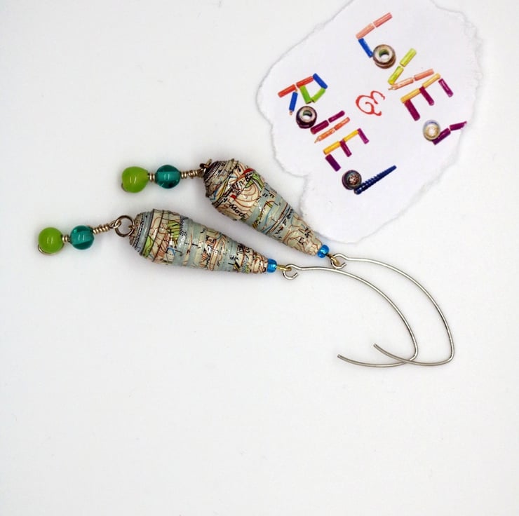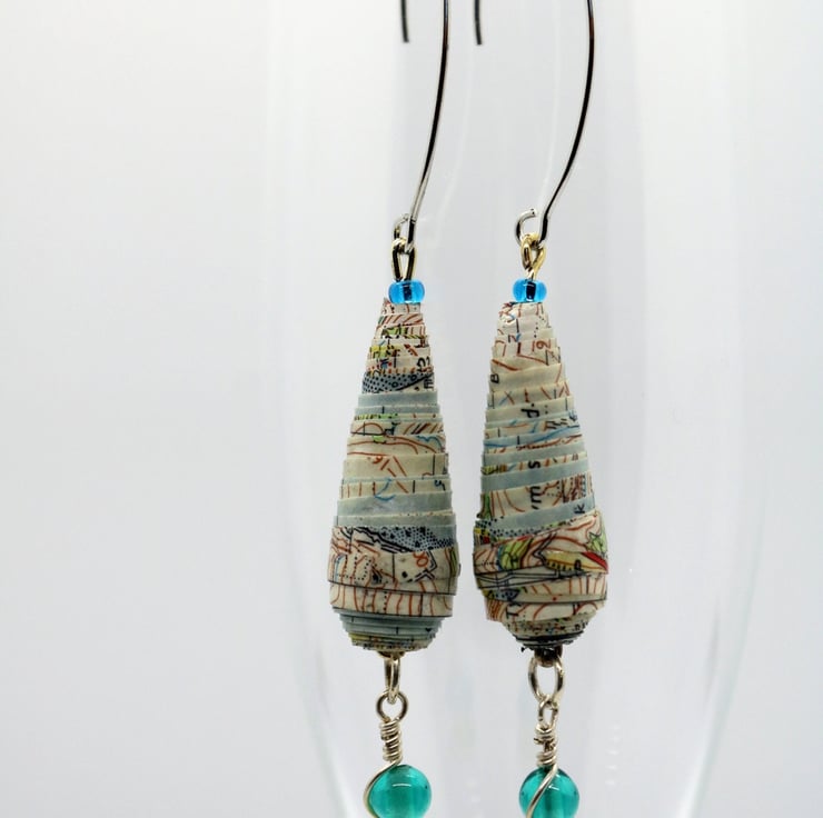 Long dangling earrings, made of an old OS map recycled paper. The bead is oblong with small blue and green small plastic recycled beads at the bottom