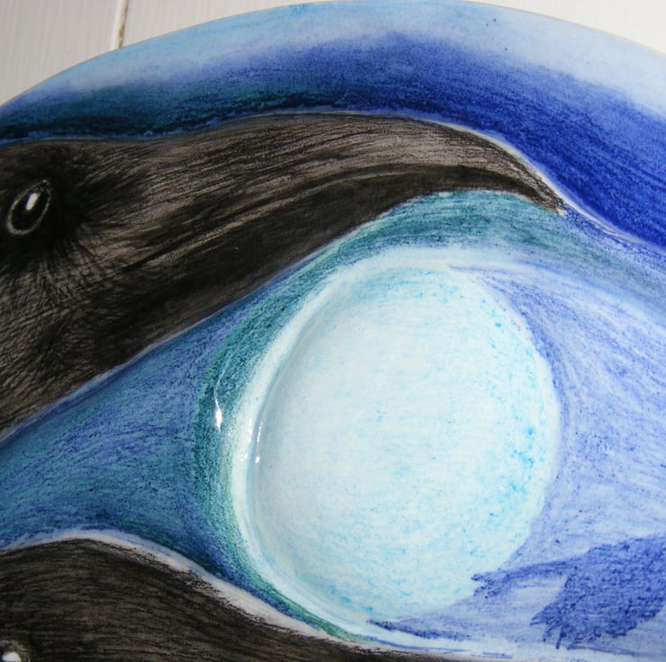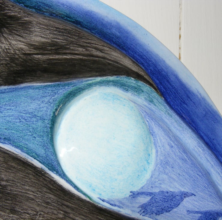 Ceramic wall art, hand carved and hand painted, fired and glazed.