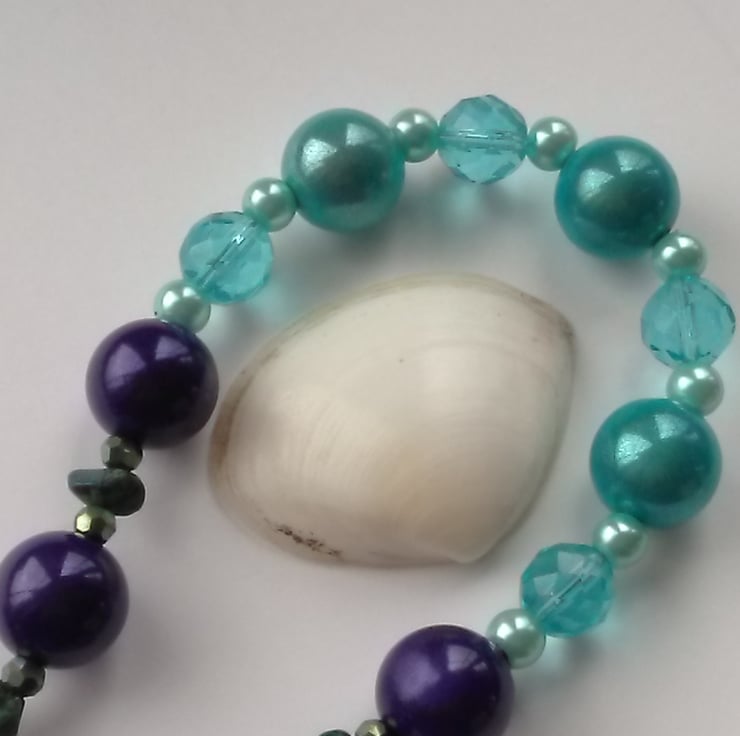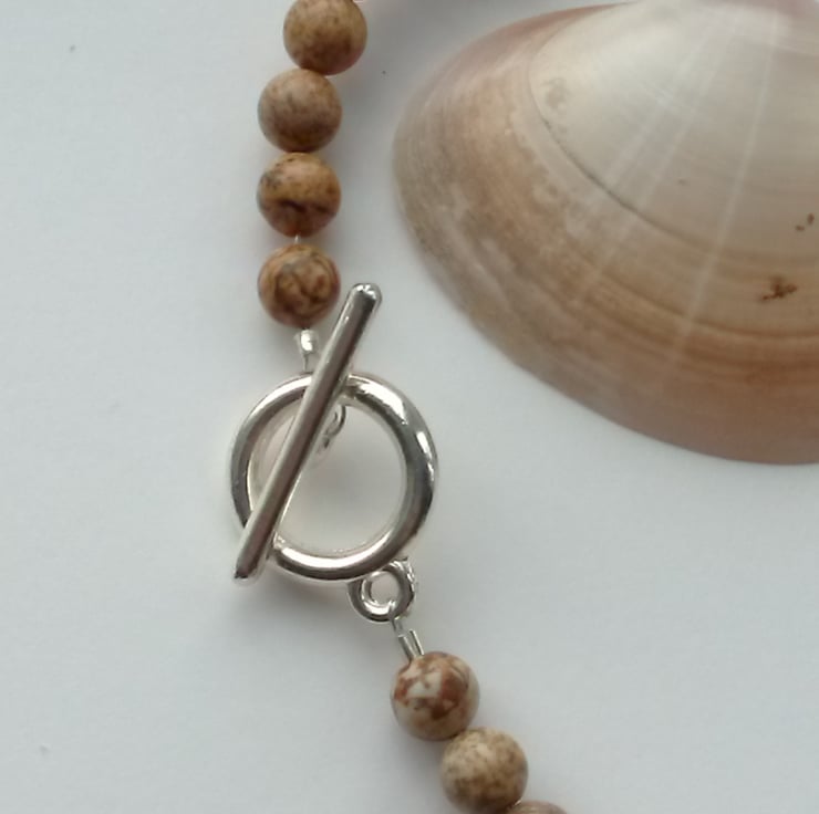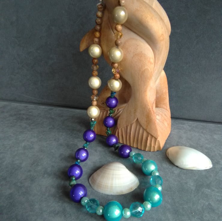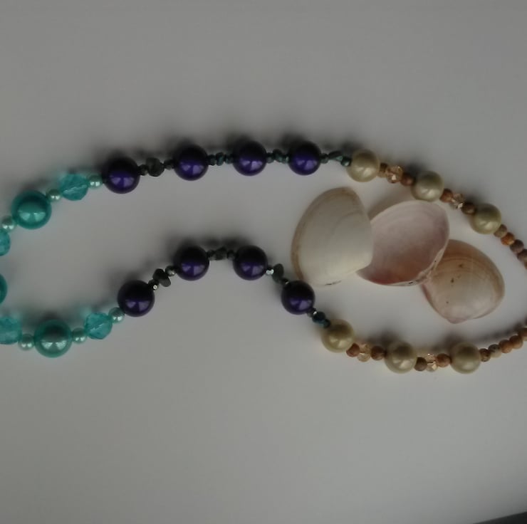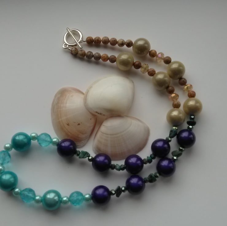 A gorgeous mixture of sea and sand shades make up this beaded necklace. Large miracle beads are interspersed with glass pearls, firepolished beads, shell chips and picture jasper to make an elegant statement. Easy to wear at any time of the year. Looks great worn casually over a jumper, or for warmer weather with your favourite summer outfit. Fastens with a silver plated toggle fastening.