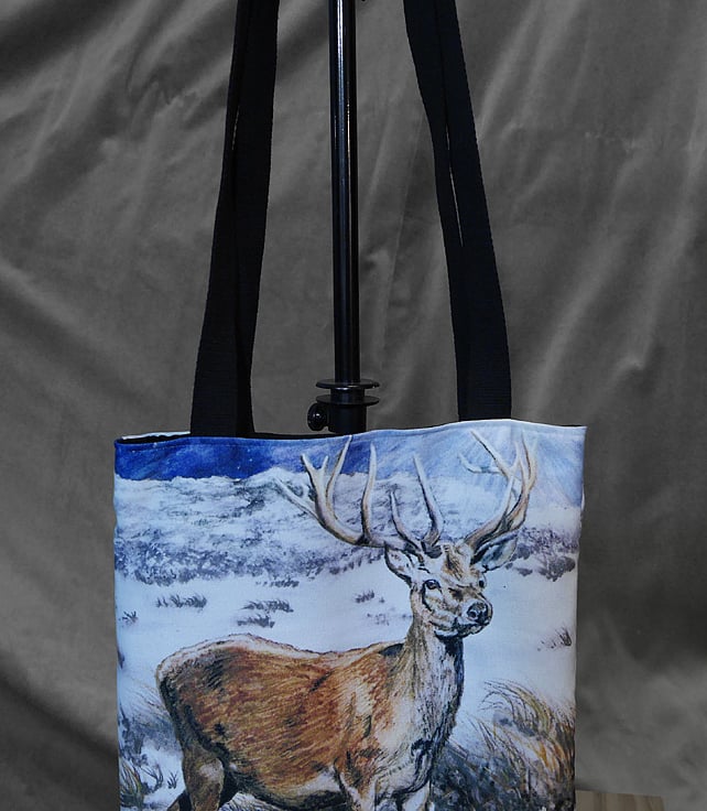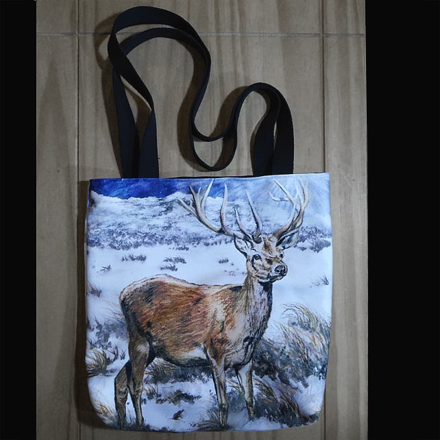 This printed bag features a young red deer stag and a tiny shrew, in a genuine Scottish Highland landscape, adapted from an illustration for my children's book "The Magical Midwinter Star" in the Adventures of Algy series.