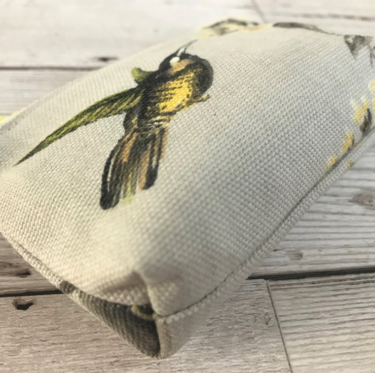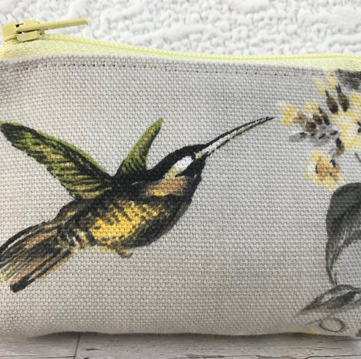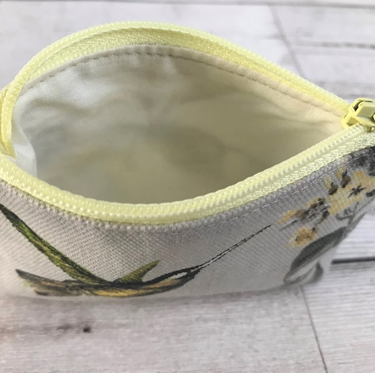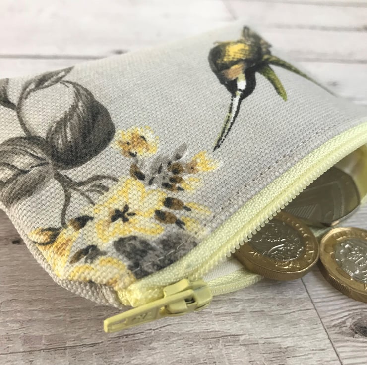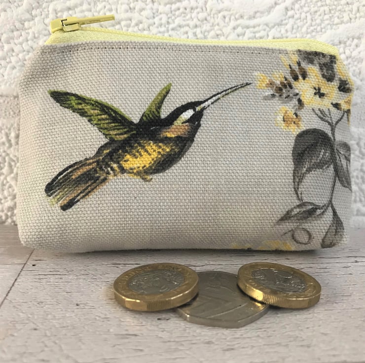 A handy small coin purse in a lovely pale beige fabric with an attractive print pattern. The pattern features a hummingbird in shades of yellow, green, brown and black alongside a cluster of yellow flowers. The coin purse has a pale yellow zip and is lined with cream fabric. The base of the purse is boxed to give more space inside.