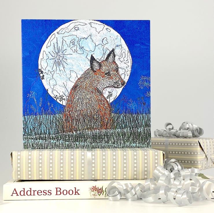 Birthday card featuring a reproduction of The Fox and the Spectacular Moon, an original textile artwork by Heidi Meier.