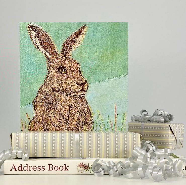 Hare Birthday card featuring a reproduction of Resting Hare, an original textile artwork by Heidi Meier.