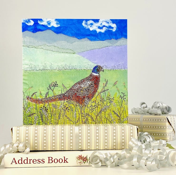 Birthday card which shows a reproduction of Pheasant amongst the Grasses' an original textile artwork by Heidi Meier.