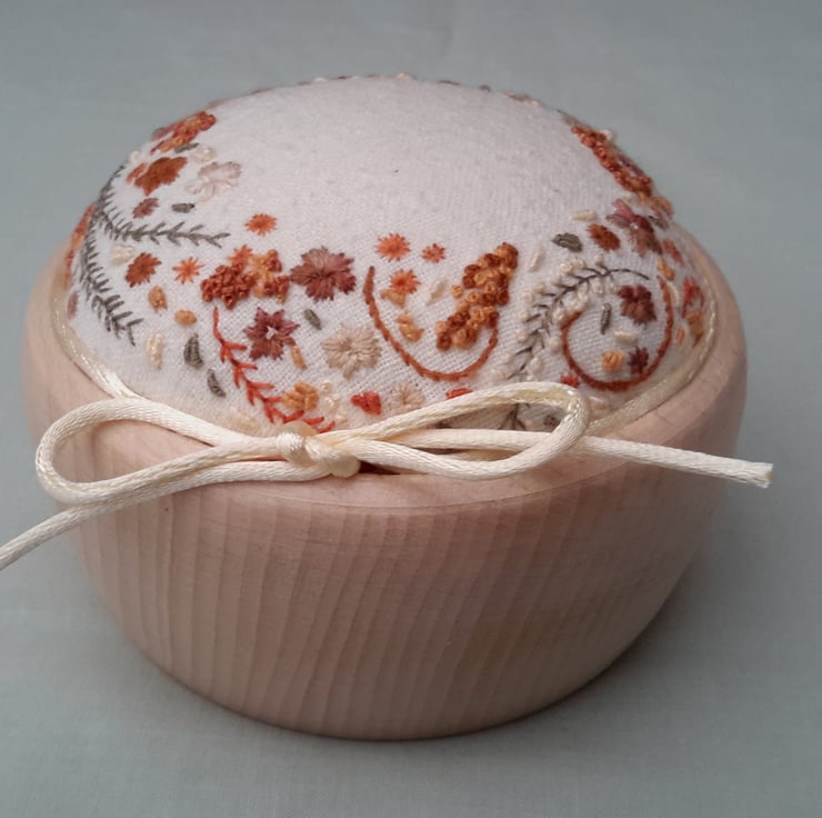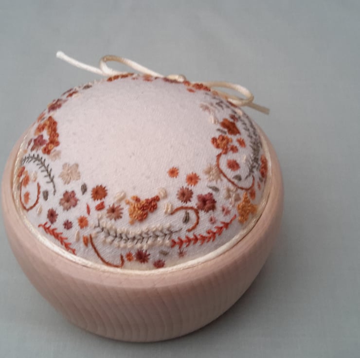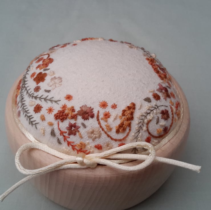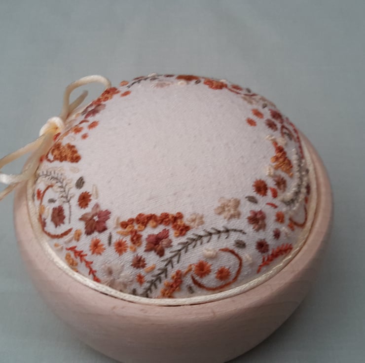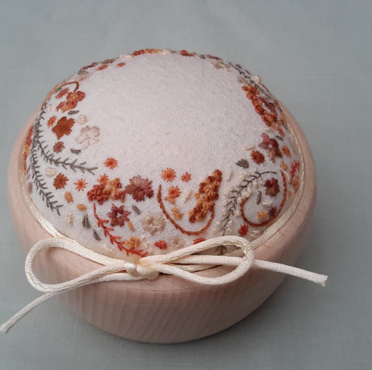 This is a very pretty hand embroidered pincushion. Inspired by the colours of autumn which I love, it has been hand sewn using various threads and stitches.