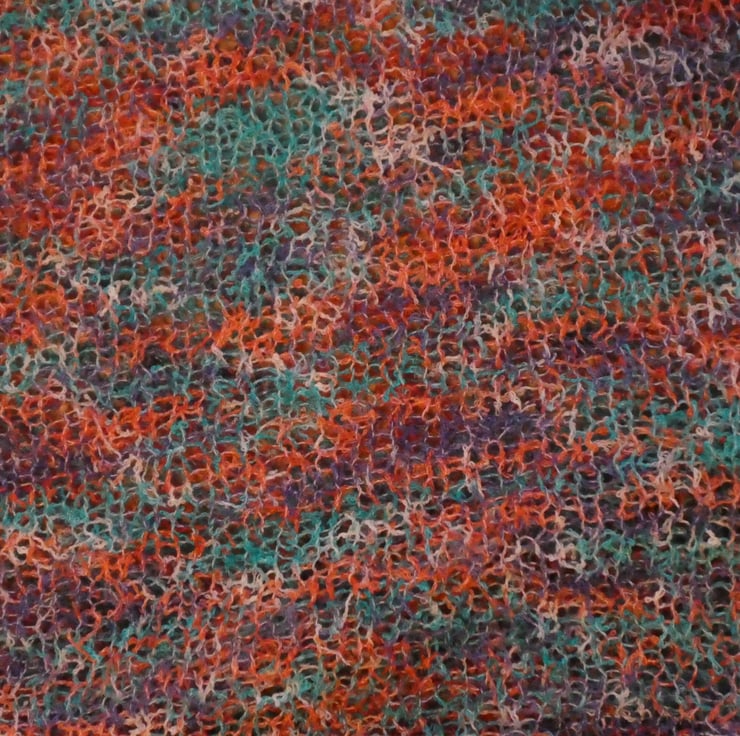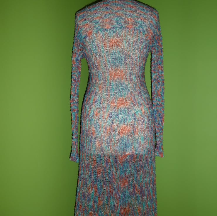 I have created this wonderful light weight top on a flat bed knitting machine. It is knit in an open circle design and attached to an upper back panel. There are lots of darts knitted into the waist to give the top flare and drape. The sleeves have a closed hem cuff are close fitting, but with plenty of stretch. The edges of the top gently roll.