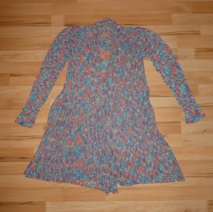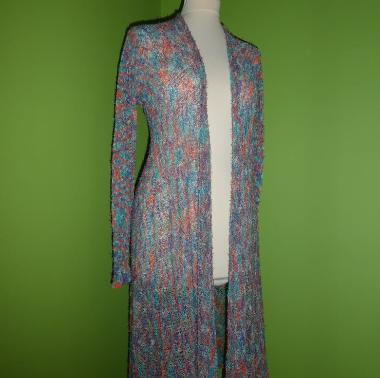 This cardigan is designed to be worn with plenty of swirls and drape and looks fabulous over jeans. It can be worn open, but looks equally good with a large brooch or belt.