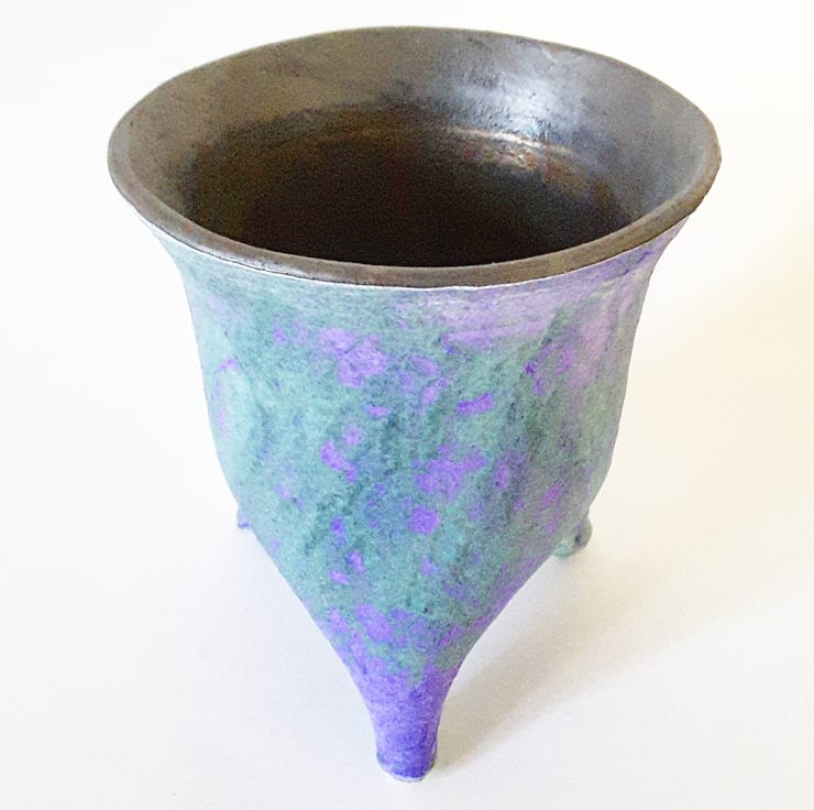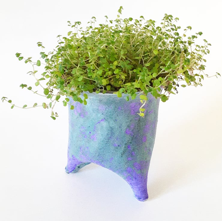 This is a handmade wheel thrown Ceramic plant pot holder with three legs