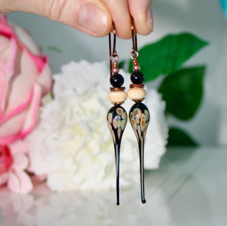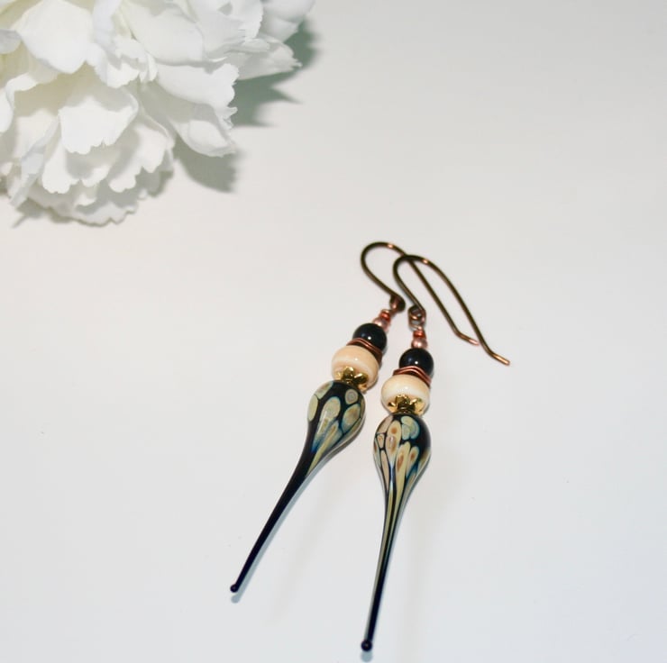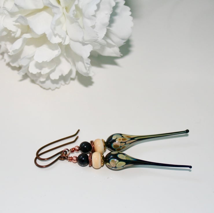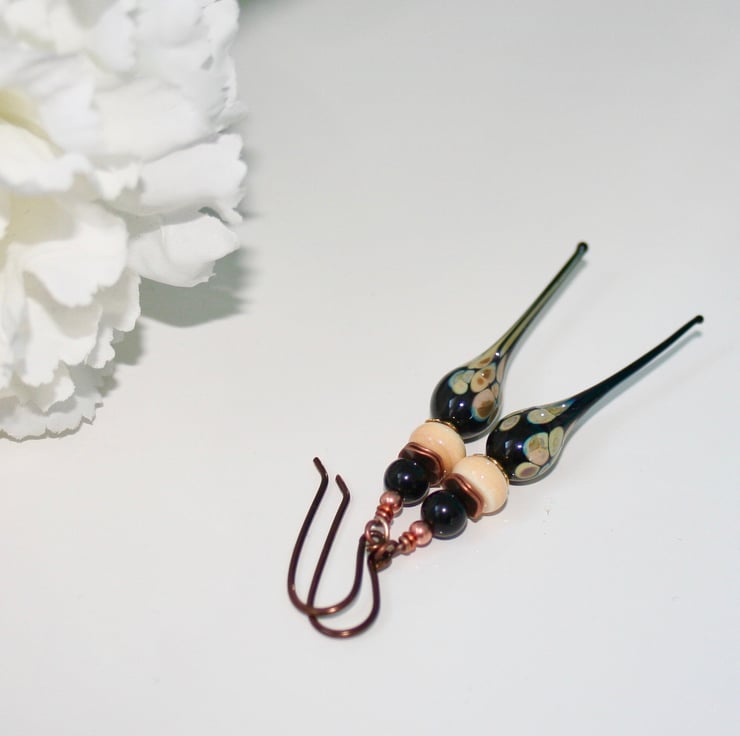 These statement earrings are made with beautiful black and cream lampwork glass headpins made by Linsey Peck. Sitting on top of the headpin is a lampwork glass cream coloured rondelle bead, a black obsidian round bead and copper spacer beads.