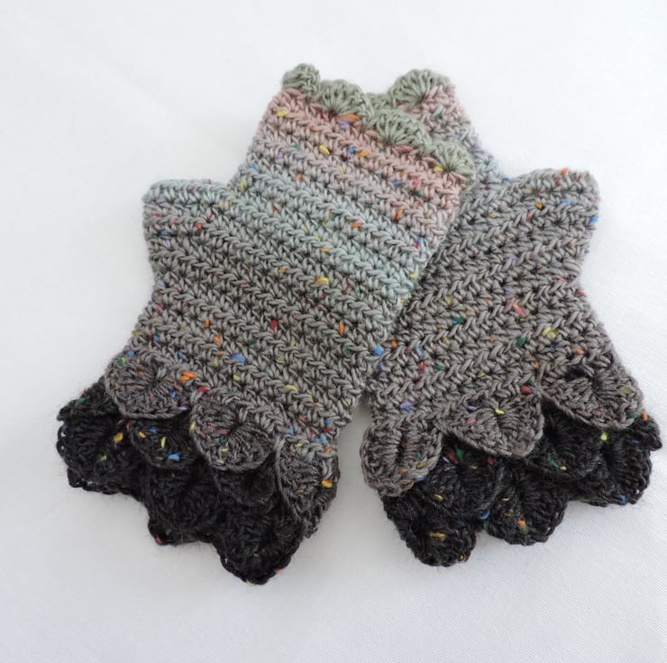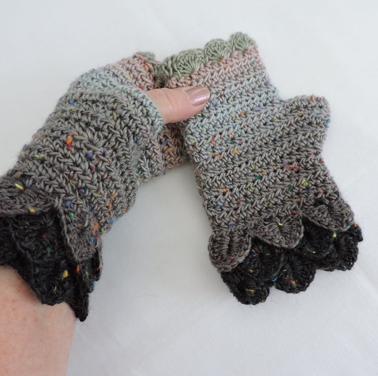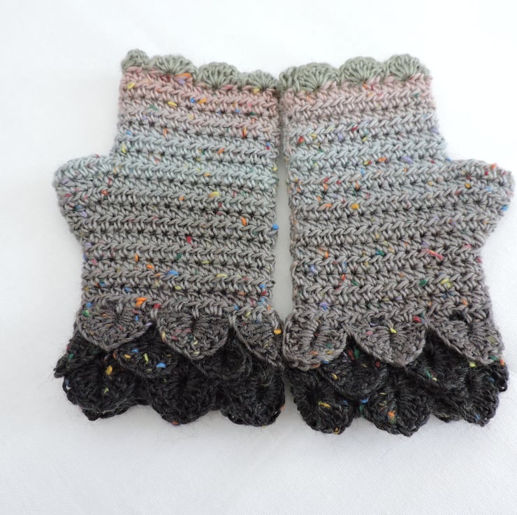 These soft and warm crochet adults fingerless mitts, wrist warmers have been made using a graduated colour acrylic and wool yarn with tweedy bits running throughout..