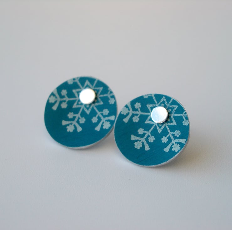 A pair of teal snowflake earrings perfect for Christmas or for your winter wardrobe. These sweet studs are made from aluminium which I have dyed in a rich teal colour and printed with a silver snowflake design. The dye is sealed in so that it is permanent and I have cut out the disc shape and filed it all by hand. I have domed the discs so that they have a subtle concave appearance. Finally, I've drilled holes for the sterling silver studs to feed through. It's not possible to solder aluminium so the studs are held onto the ear by pressure from the butterfly at the back.