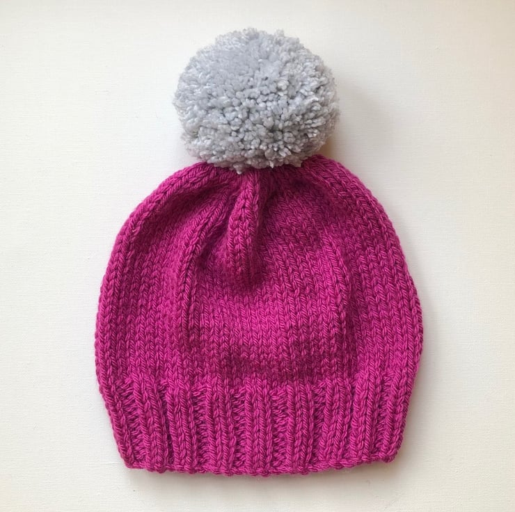 This bobble hat is hand knitted in a pink chunky acrylic yarn with a large pale grey chunky and squishy pom pom sewn on.