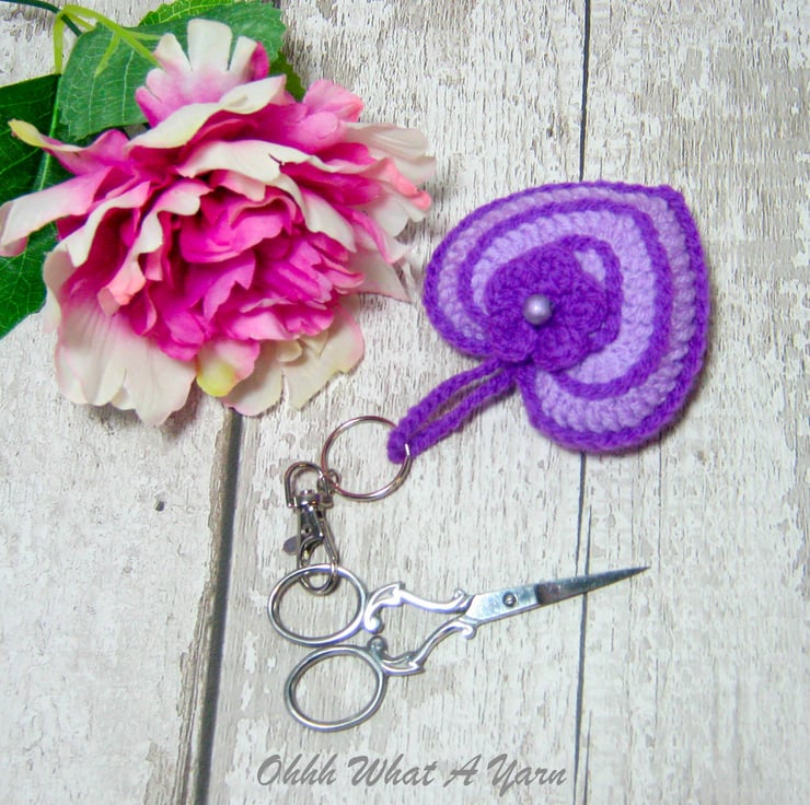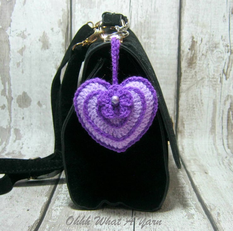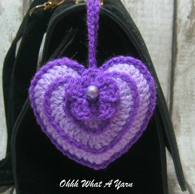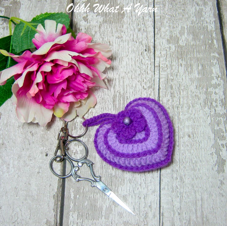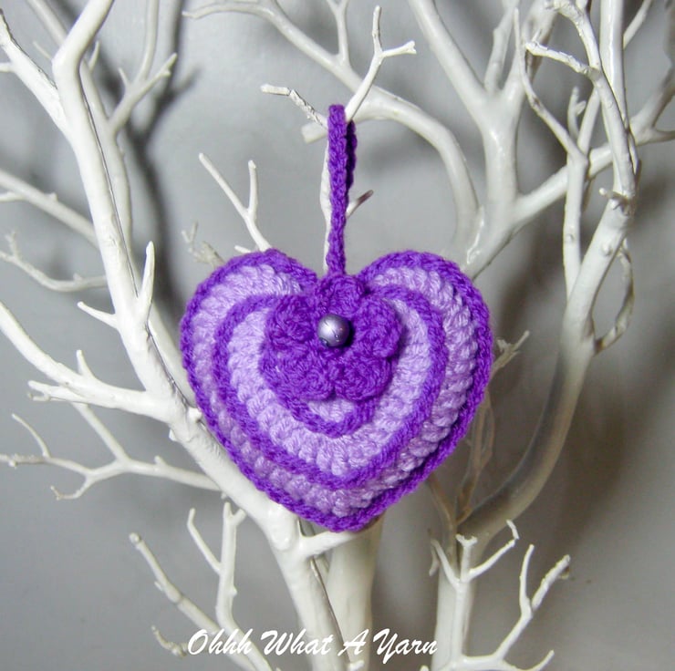This pretty lilac and purple hanging heart is lightly stuffed with toy stuffing and a little bag of Yorkshire lavender. It has a little crochet flower with a bead centre.