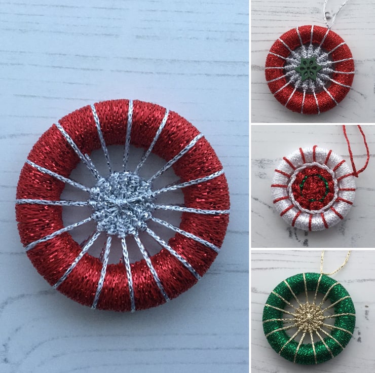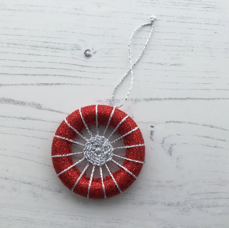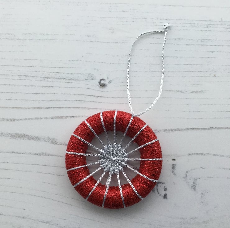 I have made this Dorset button decoration on a 2.25” (6cm) wooden ring using a red sparkly thread for the outer circle.