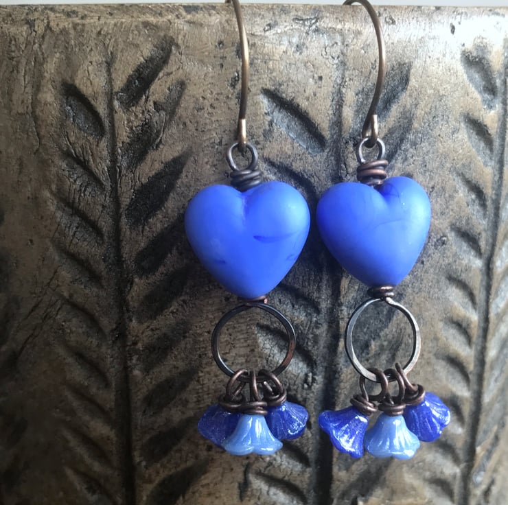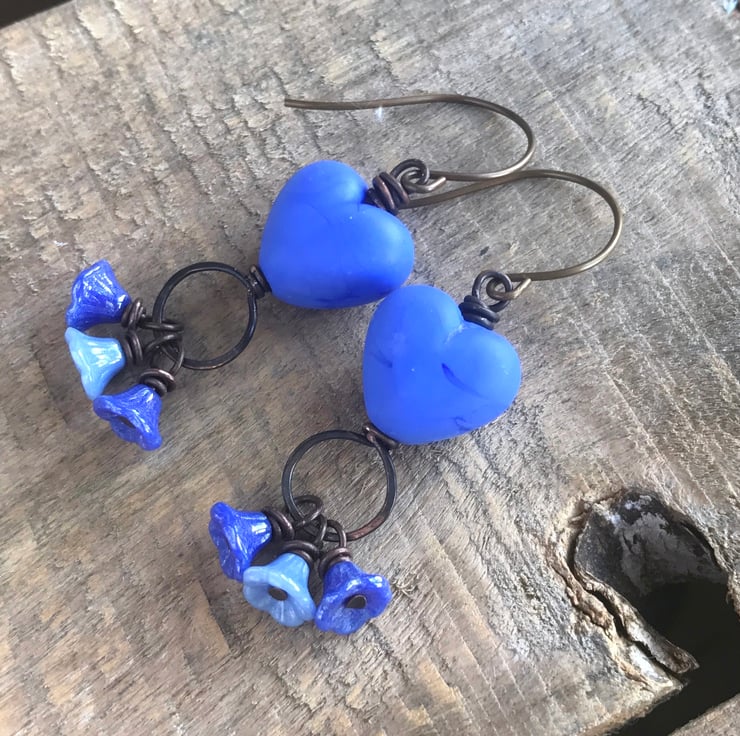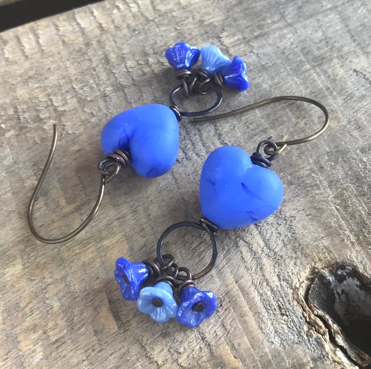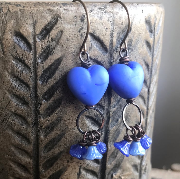 Below are hand formed and hammered loops of oxidised copper wire, with a cluster of tiny blue Czech glass bell flowers below.