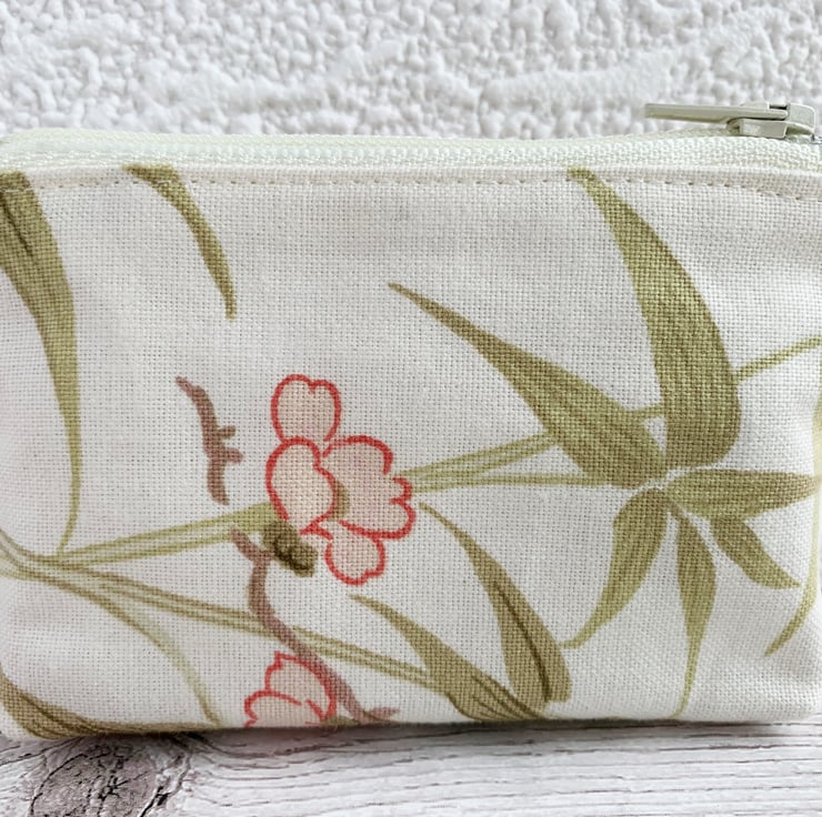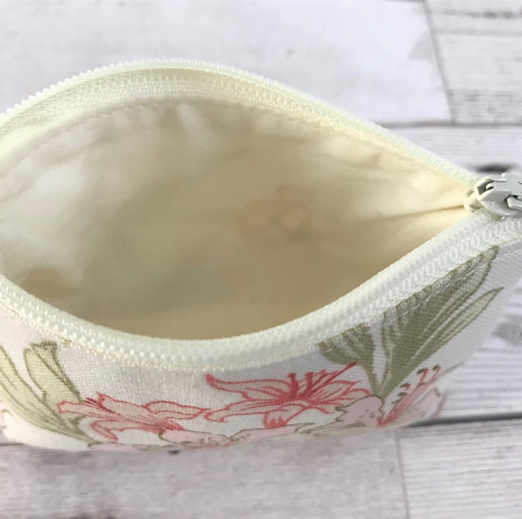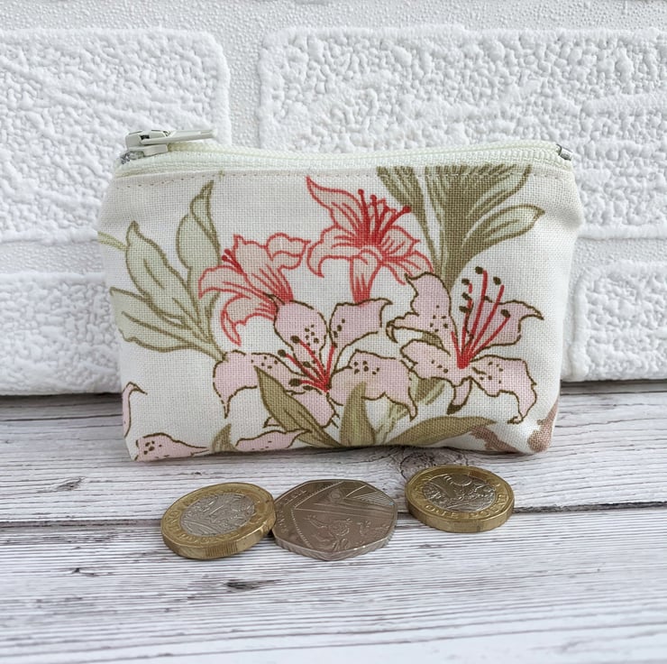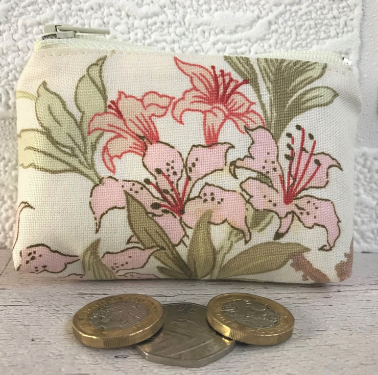 A useful small coin purse in pretty floral print fabric. The fabric is cream with a print pattern depicting red and pink lilies and sage green foliage. The coin purse has a cream zip and is lined with cream fabric. The base of the purse is boxed to give more space inside.