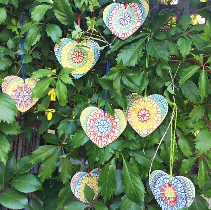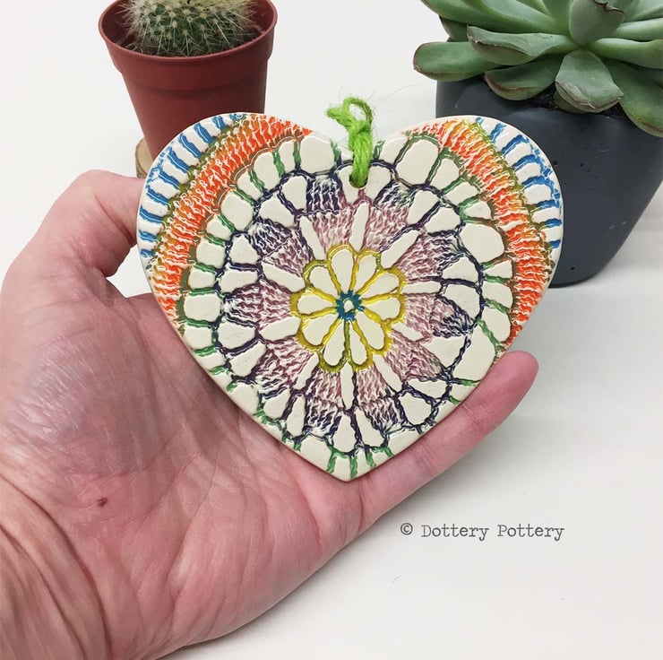 This ceramic heart is made from white earthenware clay, imprinted with pattern and colour and finished with a clear, glossy glaze. It has been fired twice, once to the bisque stage and then a second firing for the glaze. It measures 10 centimetres wide and the same in height x 5mm thick. It has a tie dye effect pattern and would be great for a festival lover. It can be hung outside.