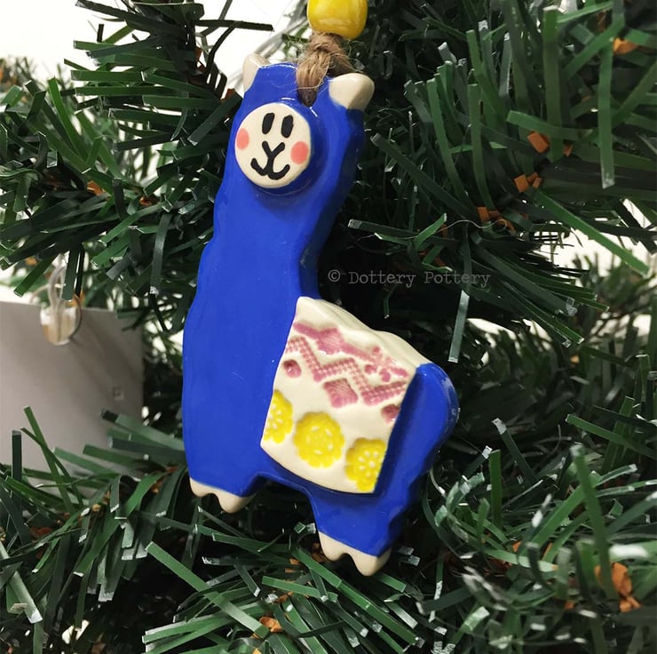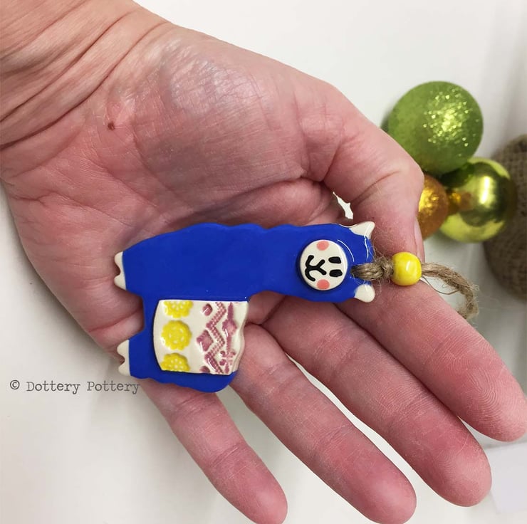 This cute little Llama is made from white earthenware clay and decorated in bright, bold glaze. it hangs from a brown string and finished with a little pearlescent bead. It measures 7cm high by 4.5cm wide by 1cm deep. Glazed on the front, plain cream clay colour on the back.You will receive a blue Llama but it may not be the one photographed - it could have a different coloured bead and blanket as each one is unique.
