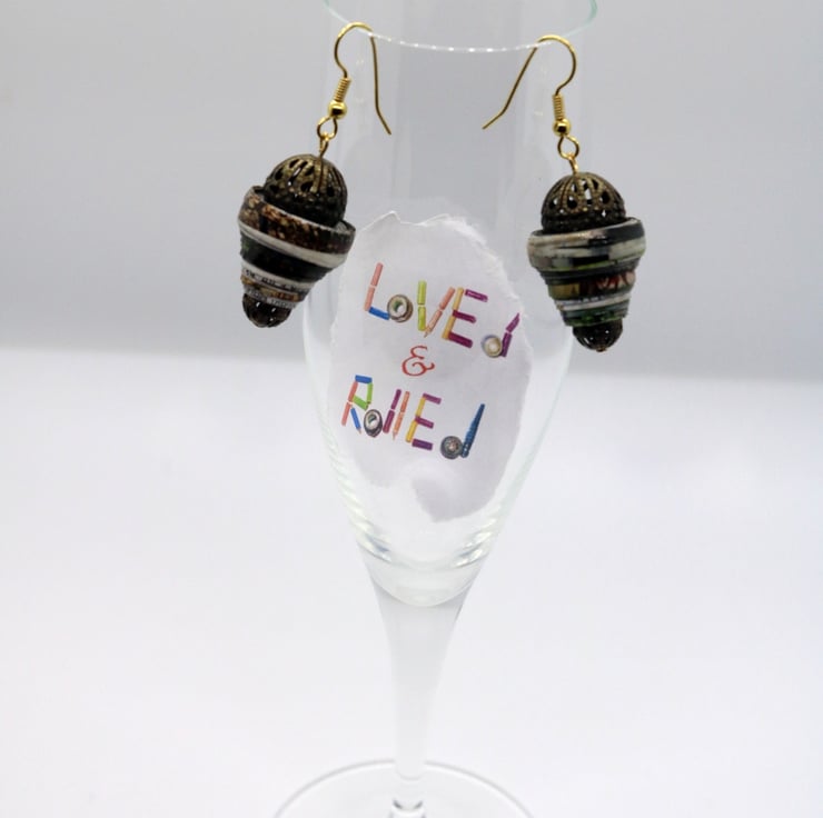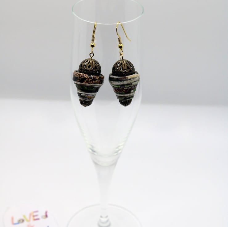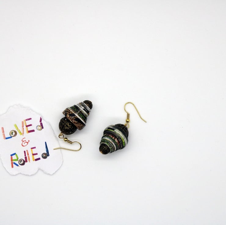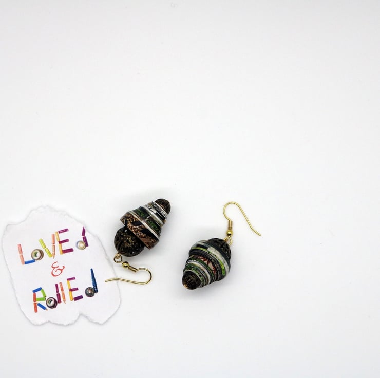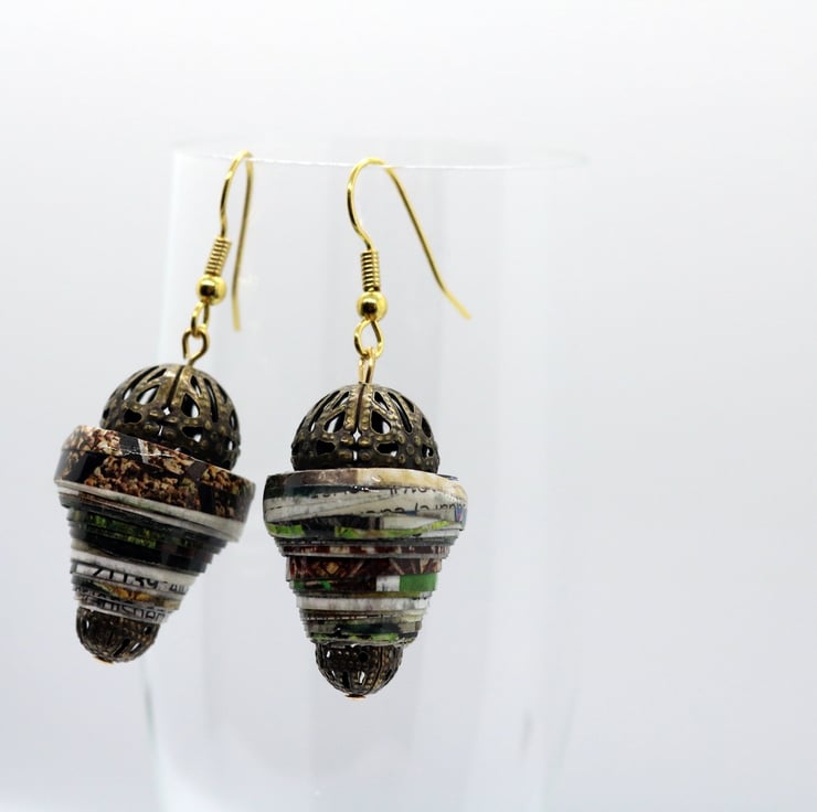 A pair of dangling earrings, medium size, made of paper beads. The beads are made of old glossy magazines, they are hand rolled into cones then varnished.