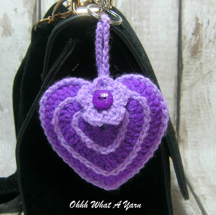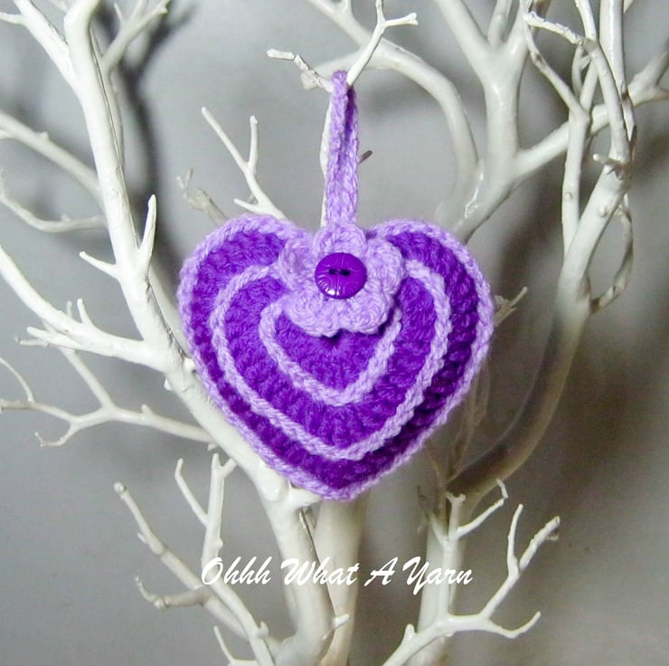This pretty purple and lilac hanging heart is lightly stuffed with toy stuffing and a little bag of Yorkshire lavender. It has a little crochet flower with a bead centre.