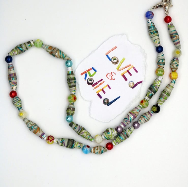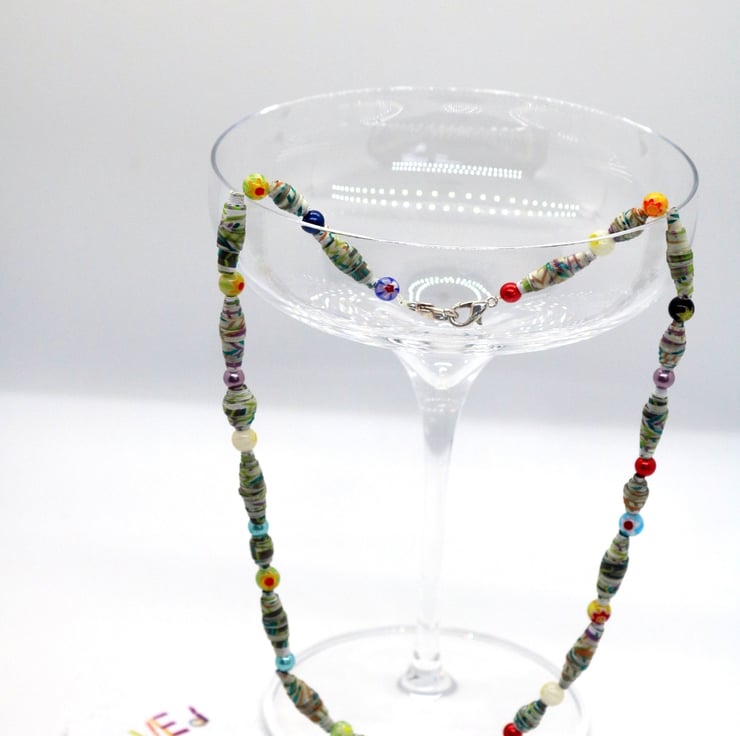 A light and colourful necklace made with recycled wrapping paper, hand rolled into paper beads. The threaded beads are interspersed with small glass beads of different colours