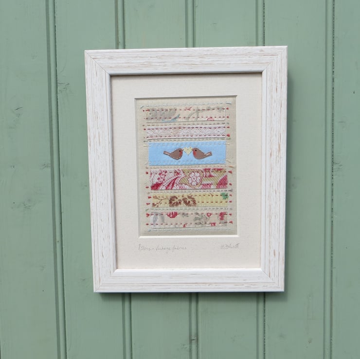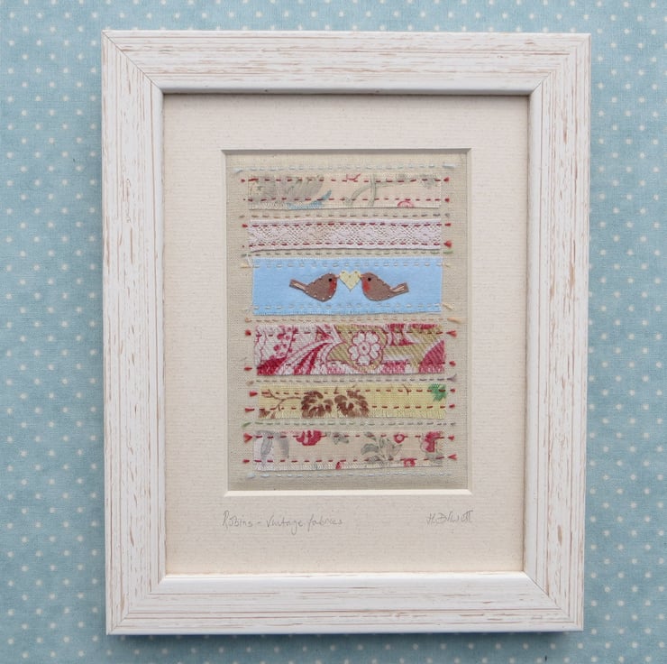The miniature textile is framed in a lightly distressed whitened wood frame measuring 6.5" x 8" (16 x 20cms) and comes glazed, corded, ready to hang, with my studio stamp on the back. The mount is signed and carries the title: Robins - vintage fabrics.