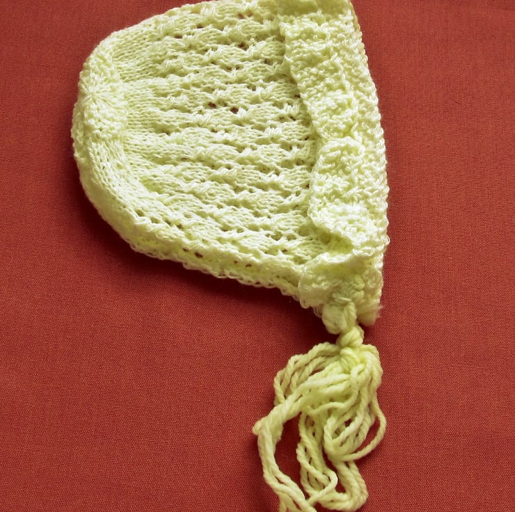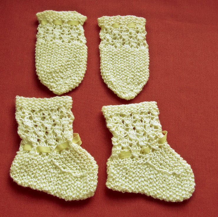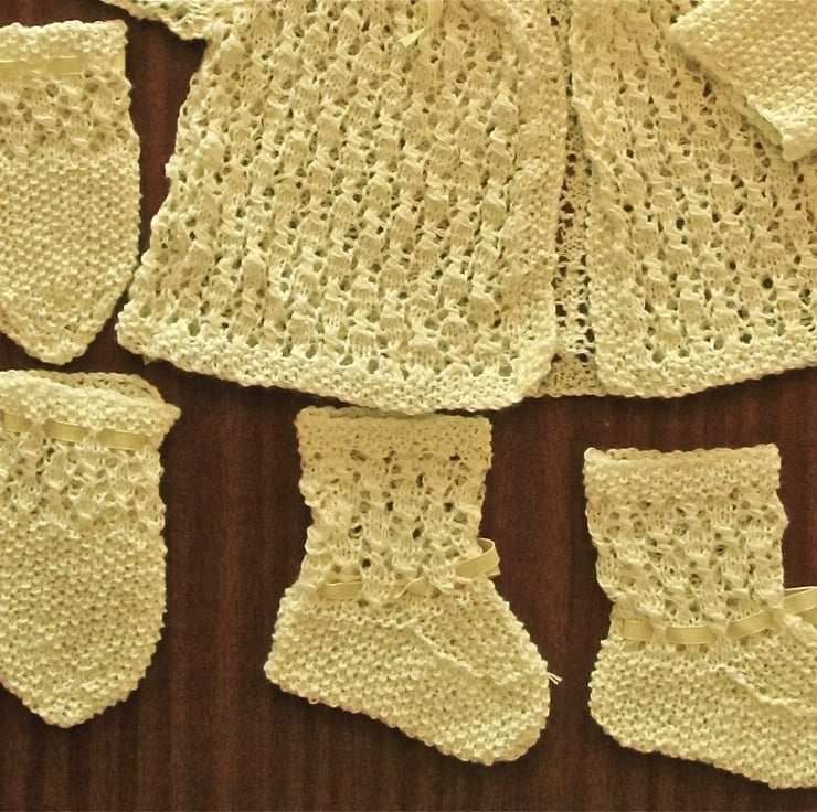 The lace pattern I used to knit this set means that the jacket, bonnet, mittens and bootees will stretch.
