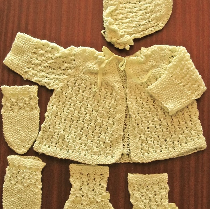 This cute, complete set consists of a hand knitted, one of a kind, yellow matinee cardigan, together with matching hat, mittens and bootees for your new family member.