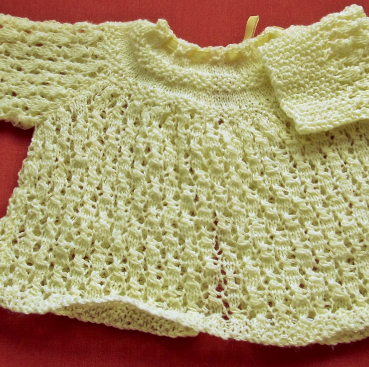 The pretty matinee coat closes with a yellow ribbon around the neck. The hat has a twisted woollen cord for closure. The mitts and the bootees have yellow ribbon for their closures too.
