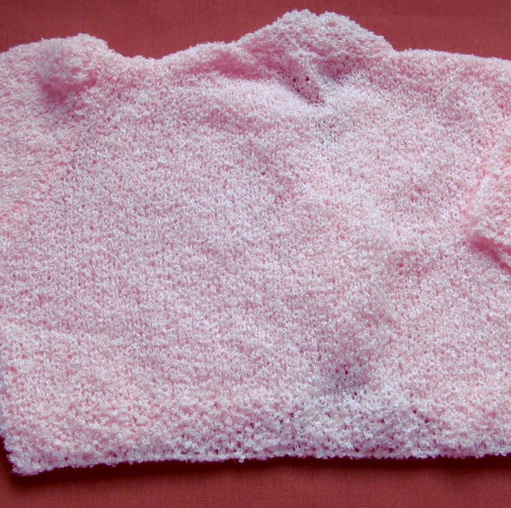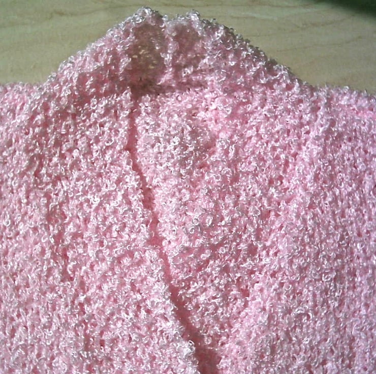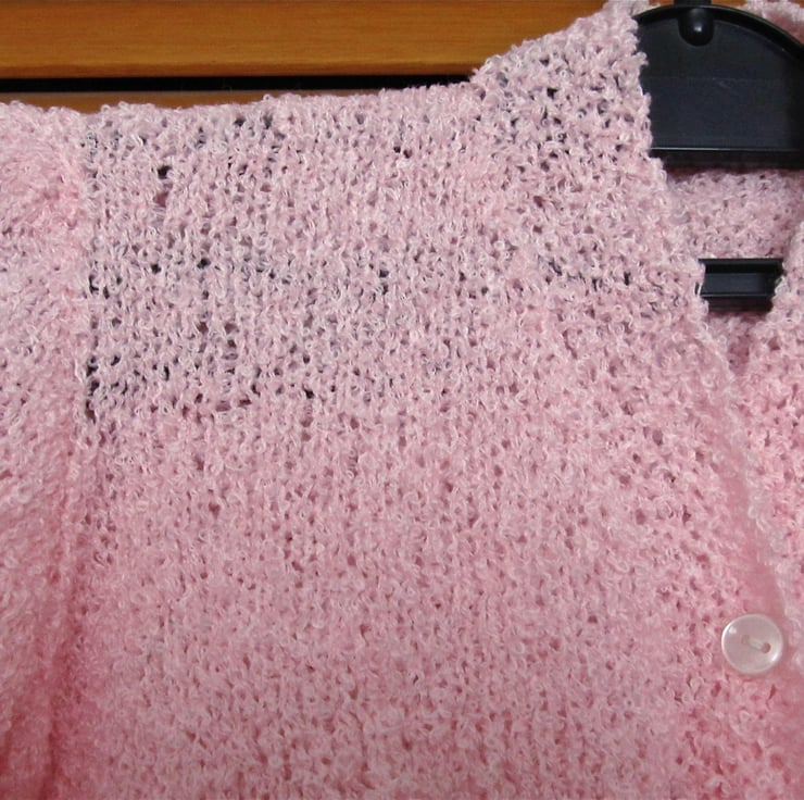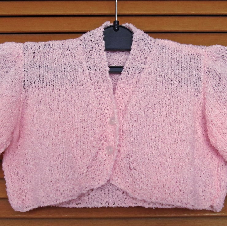 This lovely bolero cardigan is made with pink 2ply acrylic 'poodle' wool, soooooo soft, and has 2 buttons at the front for closure.