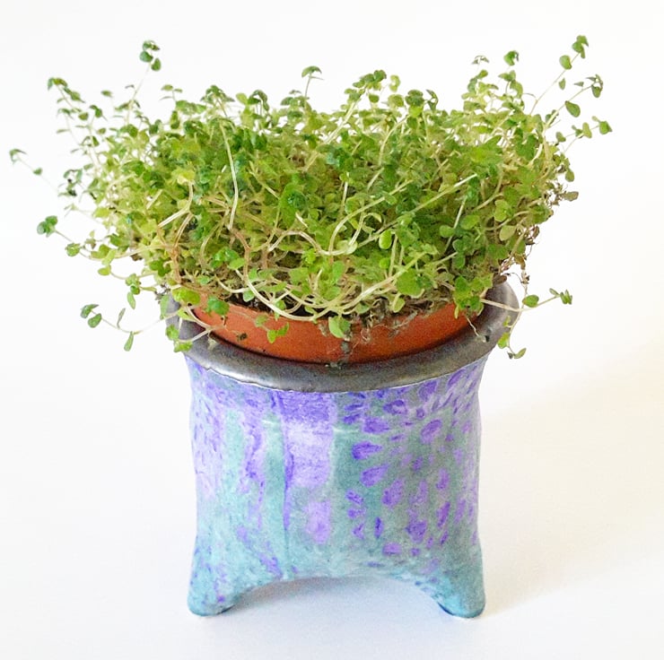 This is a handmade wheel thrown Ceramic Three legged plant pot holder for houseplants