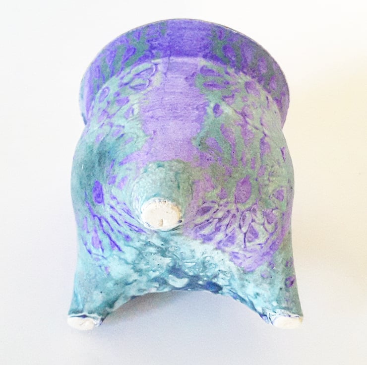 Made from stoneware clay and glazed in blue, mauve and bronze glazes