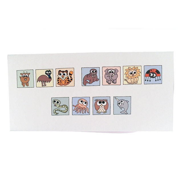 A selection of cute animals in colourful boxes, with the initials of each cartoon animal spelling out the message "get well soon".