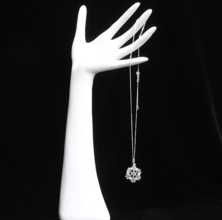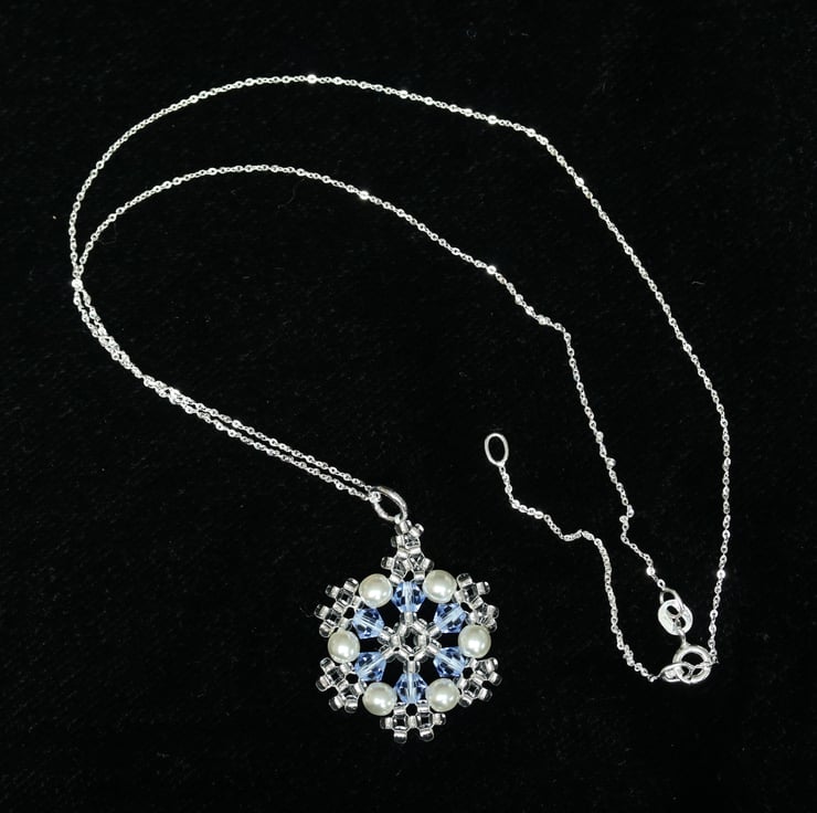 This pendant is made using a tutorial from Deb Roberti at ‘Around the Beading Table’. She gives permission for items based on her patterns to be sold by makers. She calls this pendant a ‘Renaissance Pendant’ but I have found that, when made in sparkly crystal, pale blue or white, it makes a beautiful, delicate snowflake.