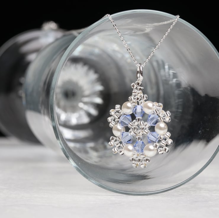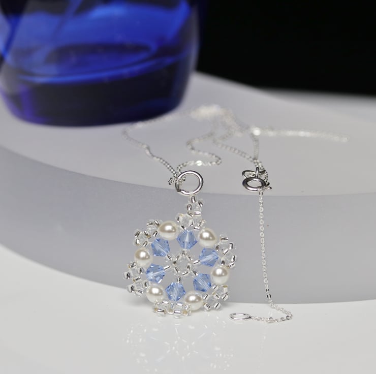 Sparkly light sapphire blue Swarovski crystals, little white Swarovski glass pearls and tiny silver-lined seed beads have been stitched together to make this delicate little pendant which is less than an inch in diameter. It hangs from a very fine sterling silver trace chain, which is adjustable in length and is finished with a bolt ring clasp.