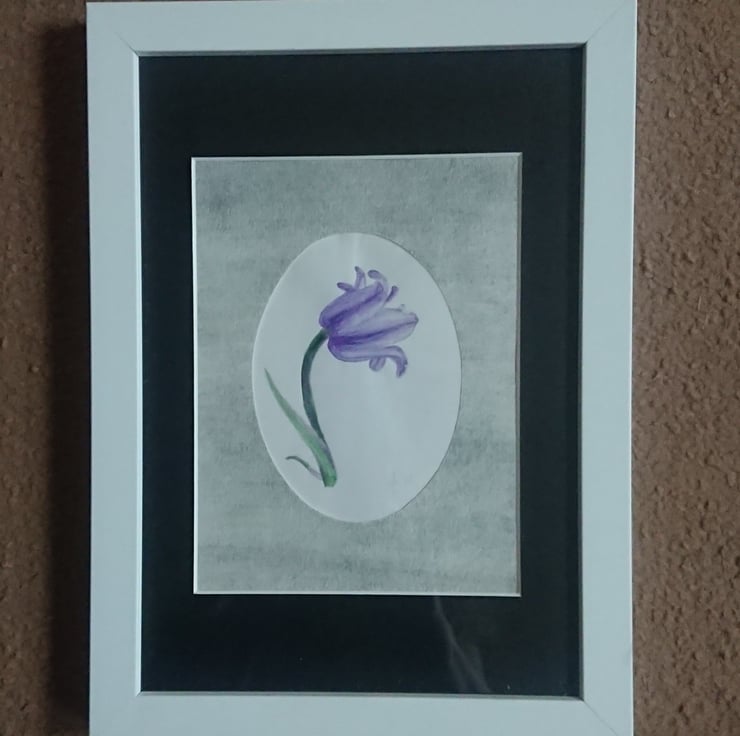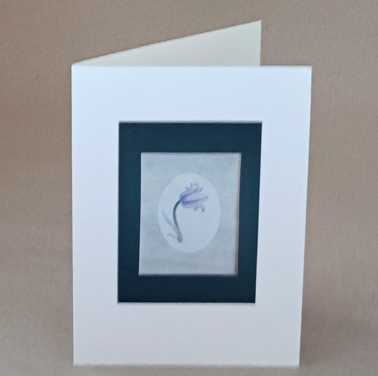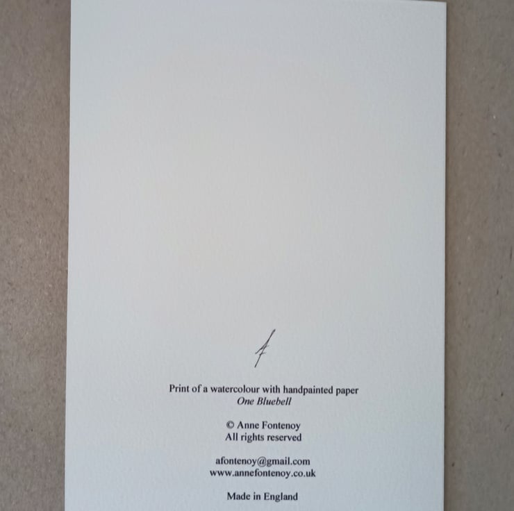 This card is a print of an original mounted watercolour painting I made of just one bluebell, that had fallen off a stalk of a spray of bluebells. This is printed from a photo of the original picture which is in a handpainted inner mount, which I painted during the summer of 2020. The framed picture then has a larger black outer mount.
