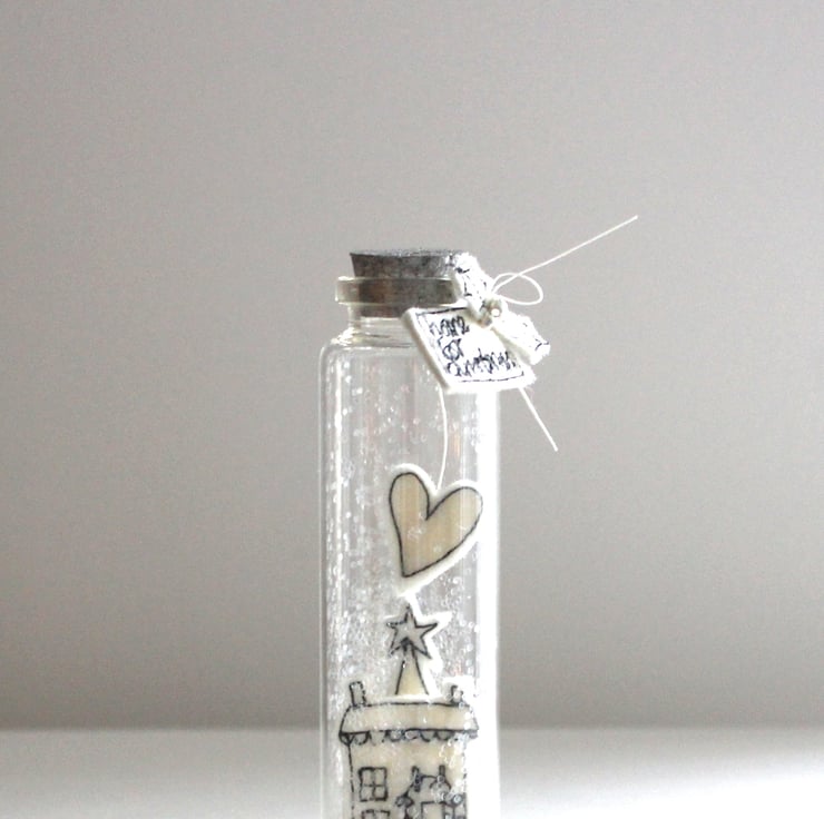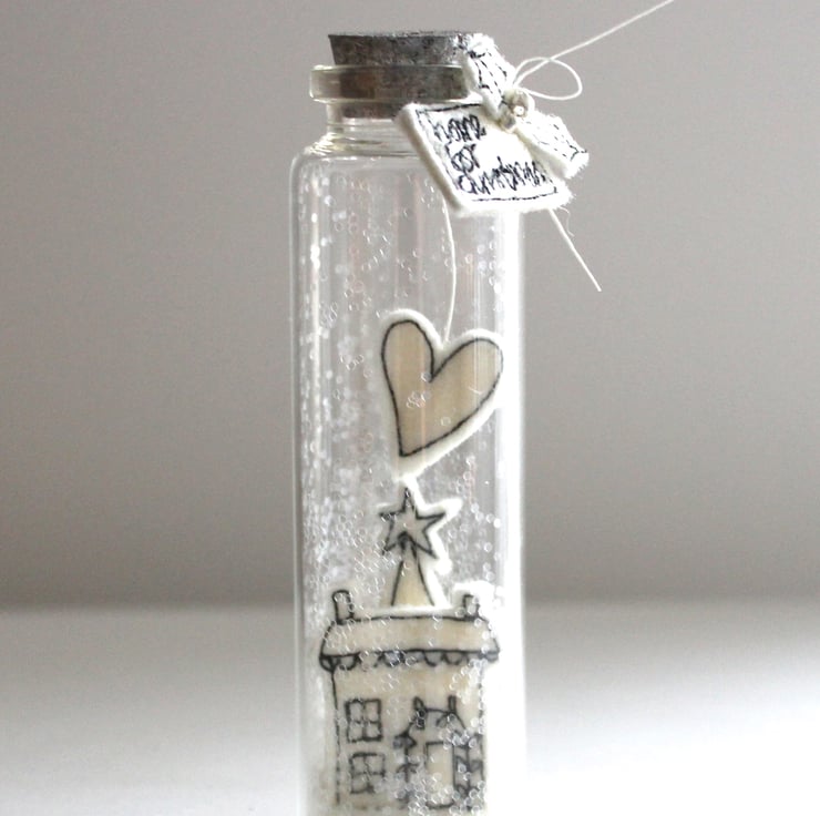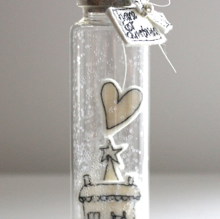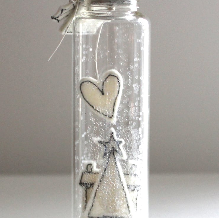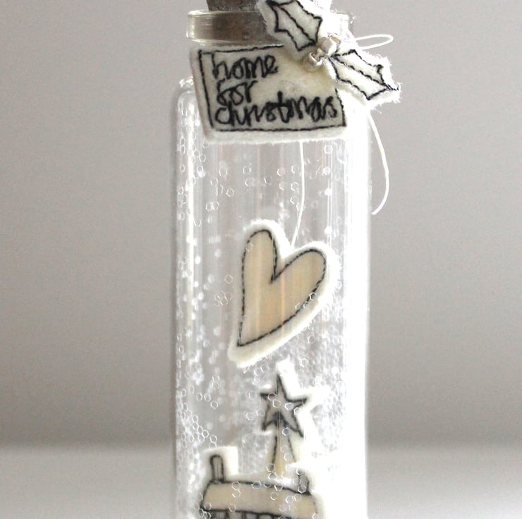 'Home for Christmas' is created using 100% cream wool felt and free hand machine embroidery. There is a sewn label attached to the neck of the glass bottle, saying 'home for Christmas' with three beads. Gently shake the bottle and the glitter starts to fall.