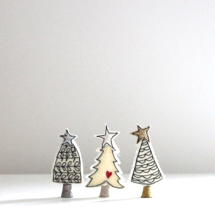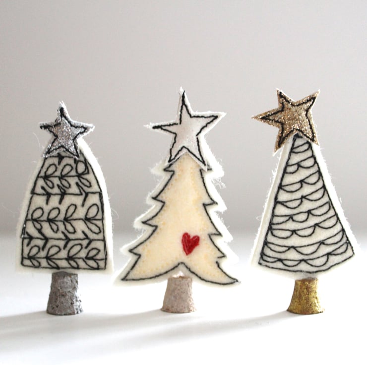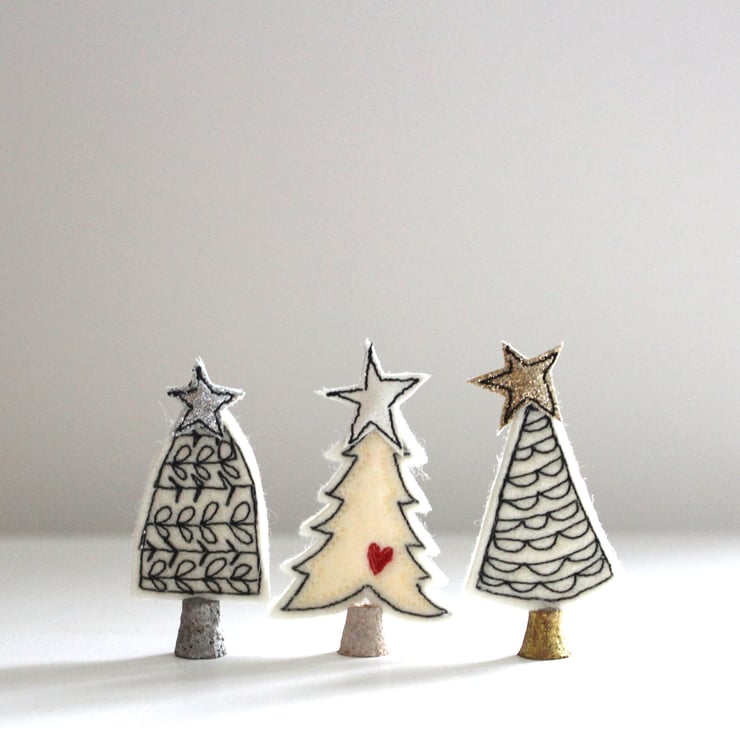 Little trees are created using free hand machine embroidery, 100% wool felt, glitter cloth and painted cork trunks. Exactly same making process as the larger trees, just on a much smaller scale!