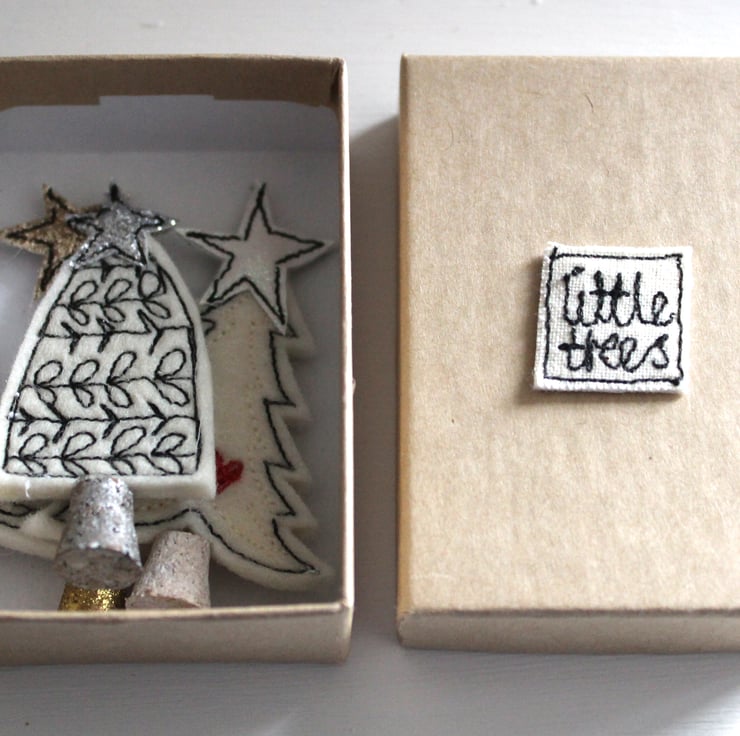 Three little trees, each with a glitter star all in a little box, with a sewn label 'little trees'.