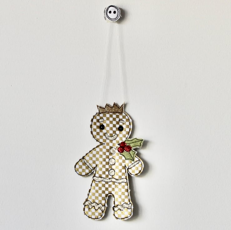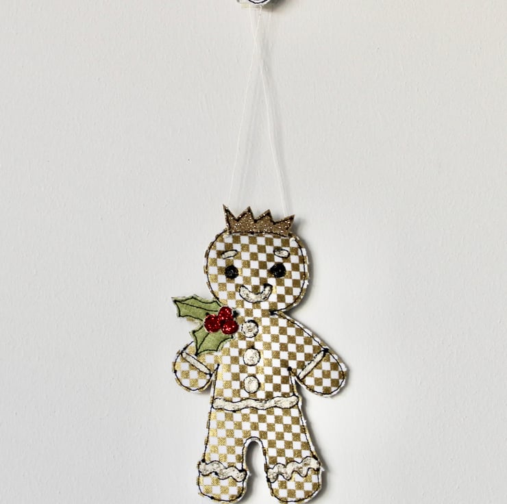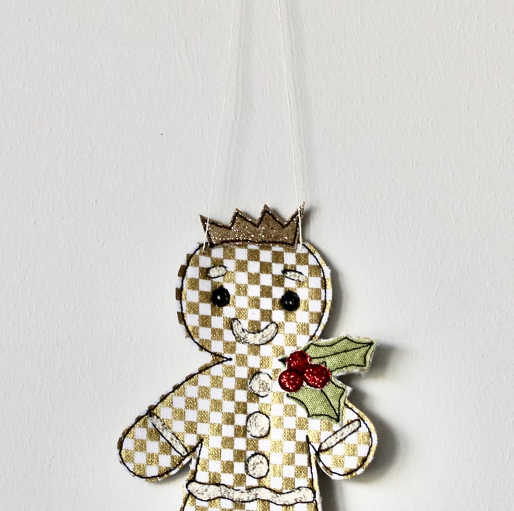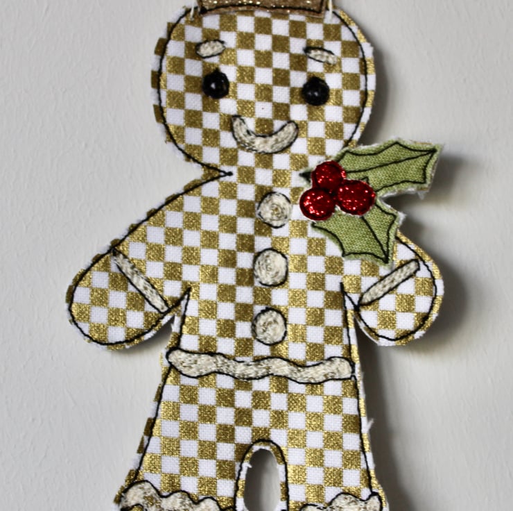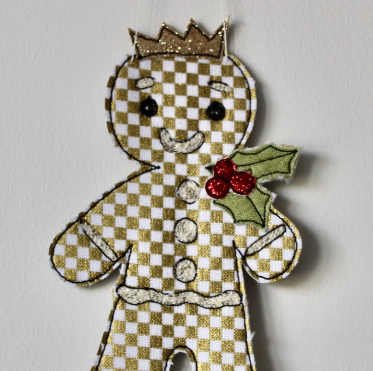 A delightful hanging decoration which is created using gold metallic checker board cloth, glitter fabric and free hand machine embroidery; multiple layers of cloth are sewn together and cut out by hand using very sharp scissors.