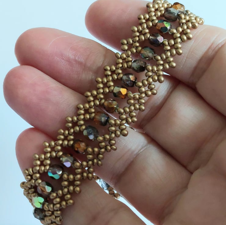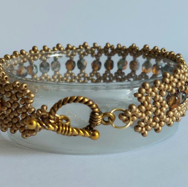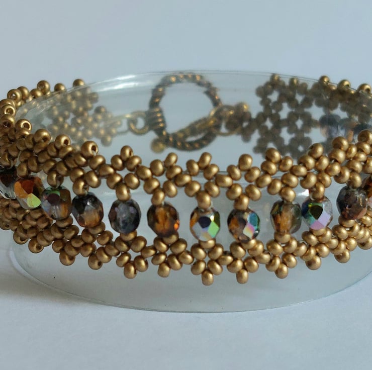 This lovely bracelet is made of metallic gold coloured seed bead and 2 tone bronze coloured fire-polish crystals. The bracelet is approx 1.75cm/ 3/4" wide, fastens with an antique gold tone toggle clasp.To fit a 17.8cm/7" wrist. It is soft and supple to wear.