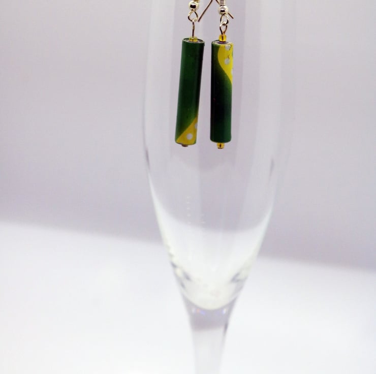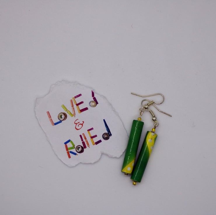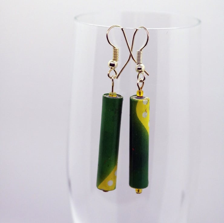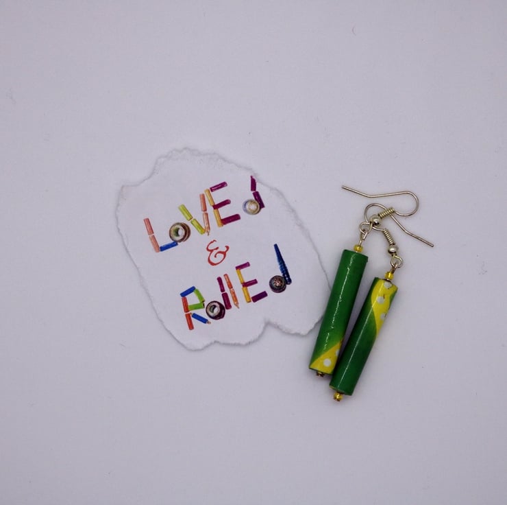 a pair of long and thin earrings made of recycled magazine paper. The paper was cut into strips, hand rolled into a long bead and then varnished.
