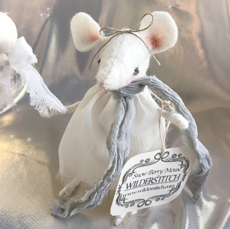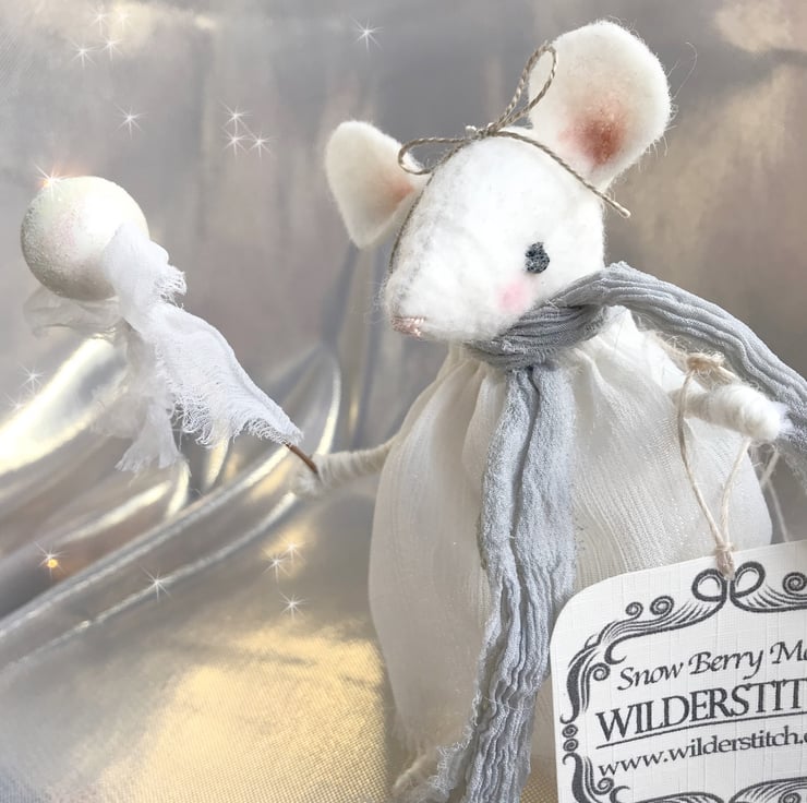 12cm free standing little Christmas mouse holding a winter berry wand ready to wave some festive magic sparkle to your celebrations. Perfect as a Christmas table place setting with a tag around her neck with your guests name written on or simply as something cheery to make your mantle piece that little bit more magical. Hand made from cotton wire and wool with a pretty sparkly sheen on her dress. Her silk scarf is hand dyed sage/grey and her face is hand embroidered and powdered with pink blush. She comes wrapped in tissue and will be posted 1st class Royal Mail.