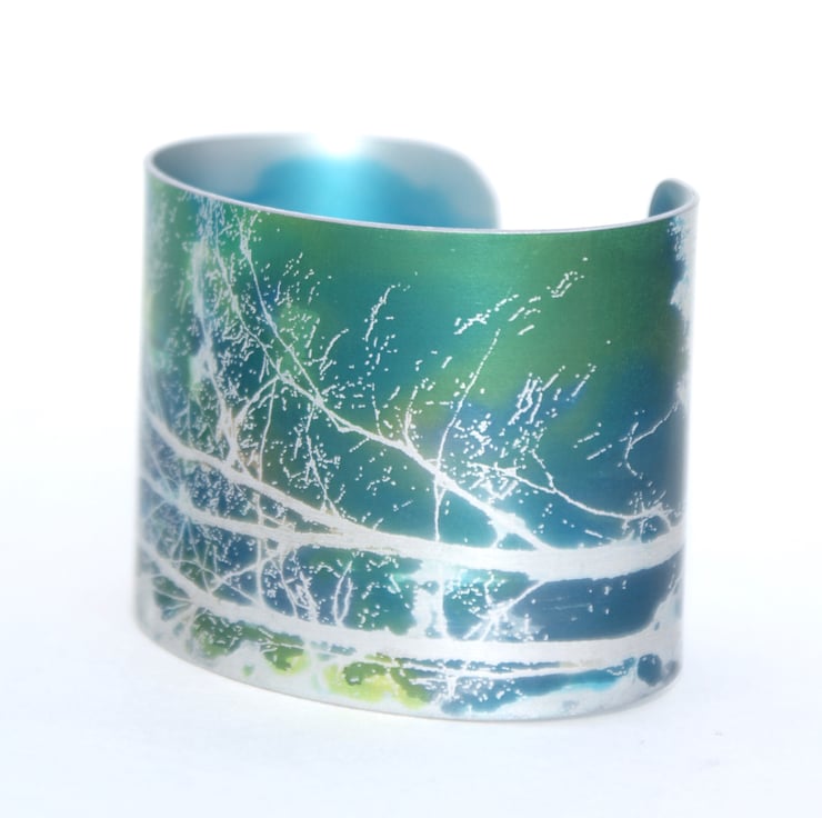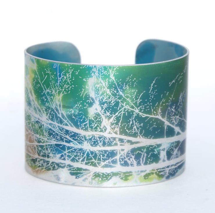 A fab cuff with the lengthways image of a tree silhouette, dyed in green, blue and grey. The image is taken from my own photograph. Please note your cuff may vary slightly from the image as each one is dyed by hand.