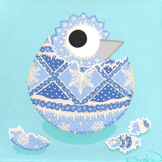 A cute cartoon chick is hatching from an egg with a blue and white snowflake design, inspired by the Ukrainian tradition of pysanky - decorated eggs. The baby winter bird has taken on the icy patterns from the egg, and is painted on a pale turquoise background.