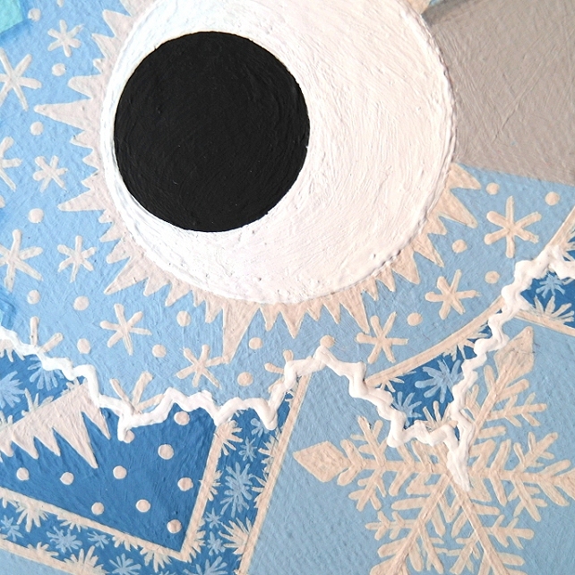 This little pysanka chick is a winter bird, it's egg with a snowflake pattern in cold blues and whites.