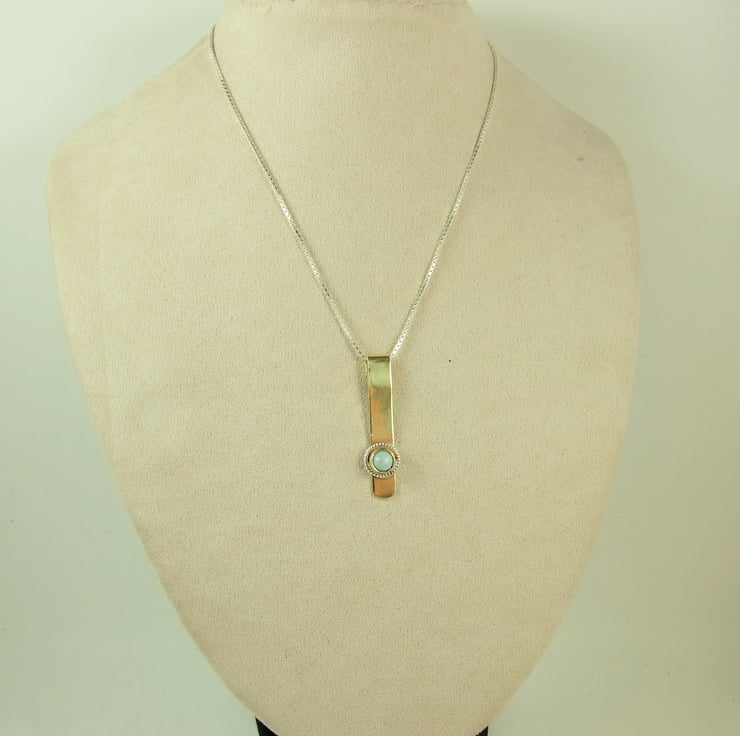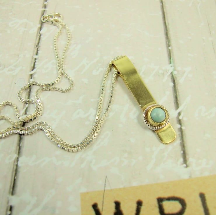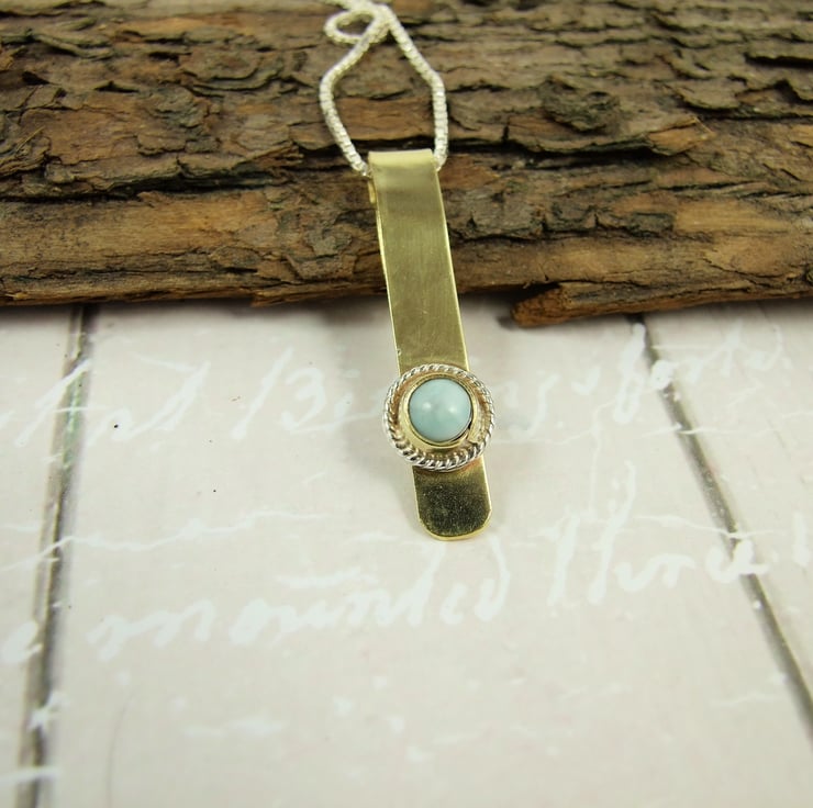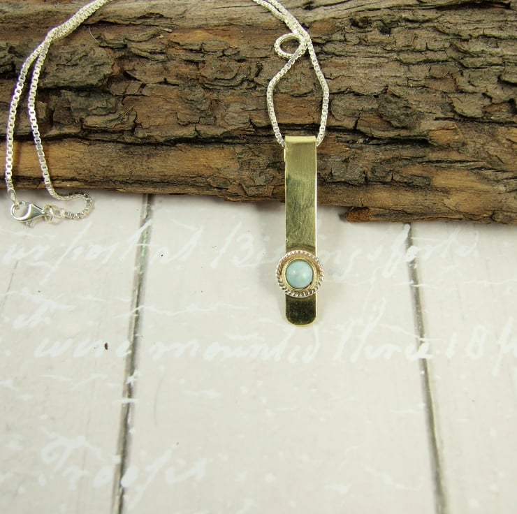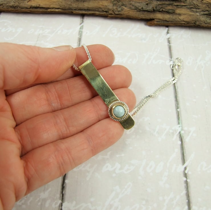 Larimar Pendant Necklace. Brass with Sterling Silver and Pale Blue Gemstone Pendant.